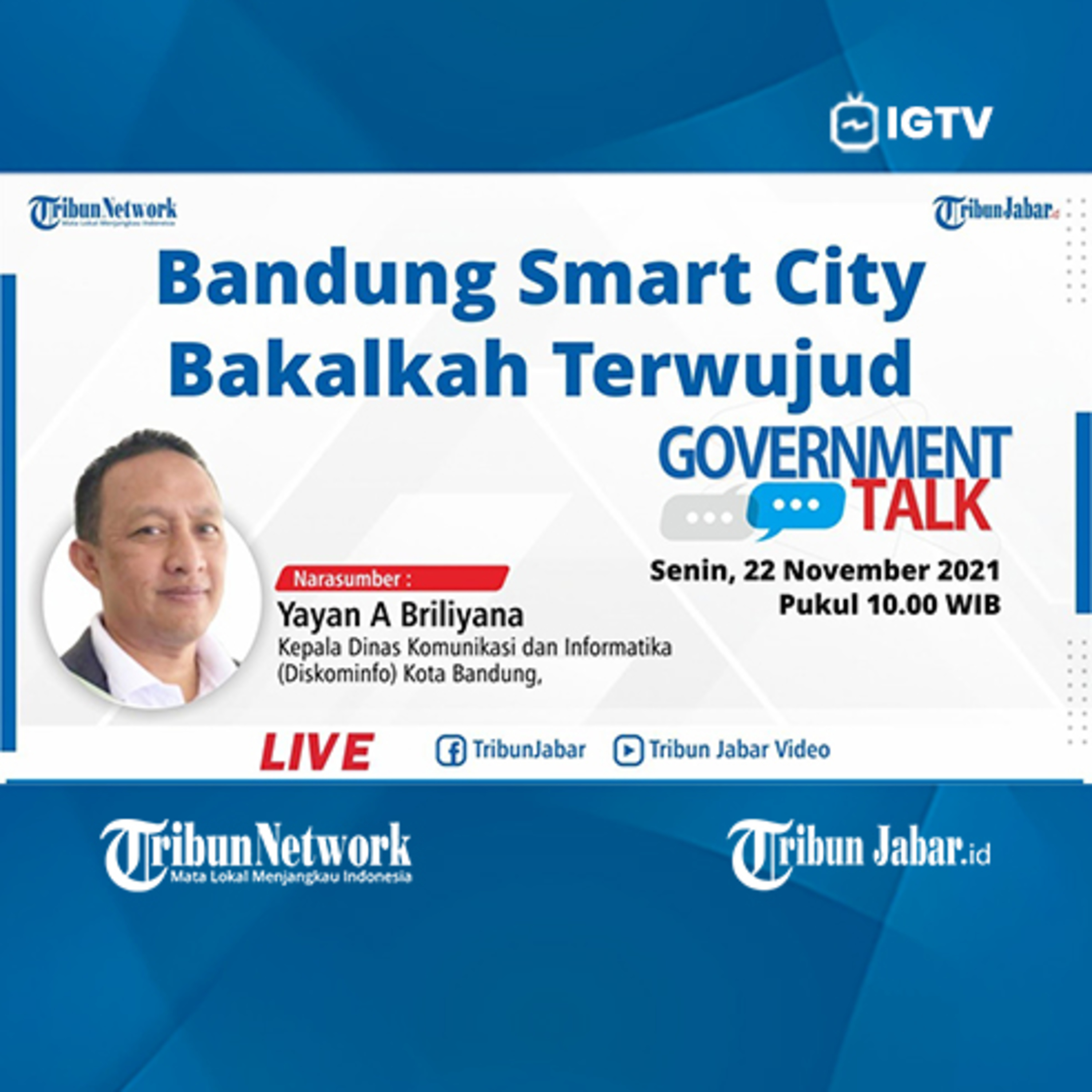 Simak perbincangan editor Tribun Jabar dengan Kepala Dinas Komunikasi dan Informatika (Diskominfo) Kota Bandung, Yayan A Briliyana di Government Talk, Senin (22/11/2021) pukul 10.00.