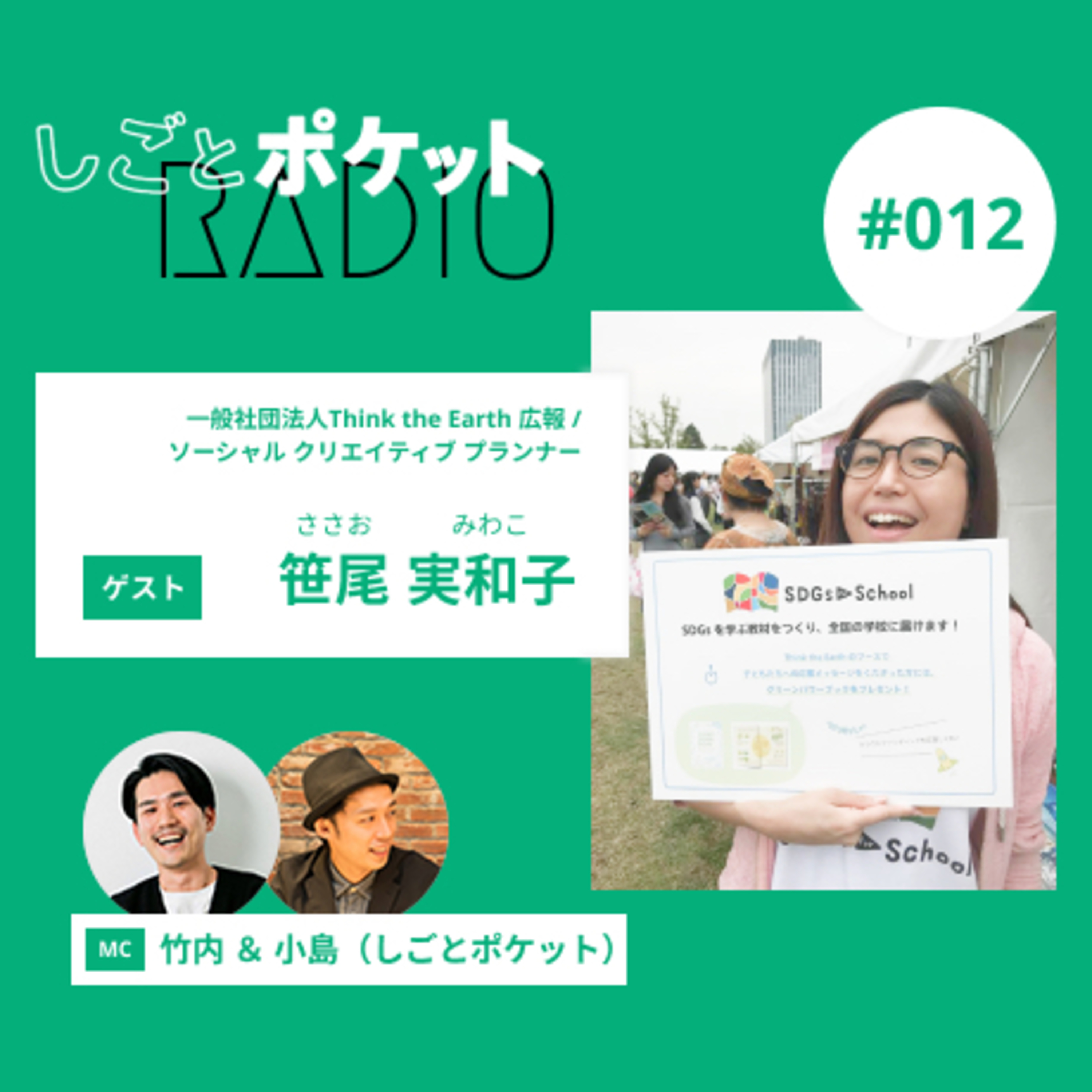 今回のゲストは、一般社団法人Think the Earth 広報 / 株式会社スペースポート ソーシャル・クリエイティブ・プランナーの笹尾 実和子(ささお みわこ)さんにお話しを伺いました。
