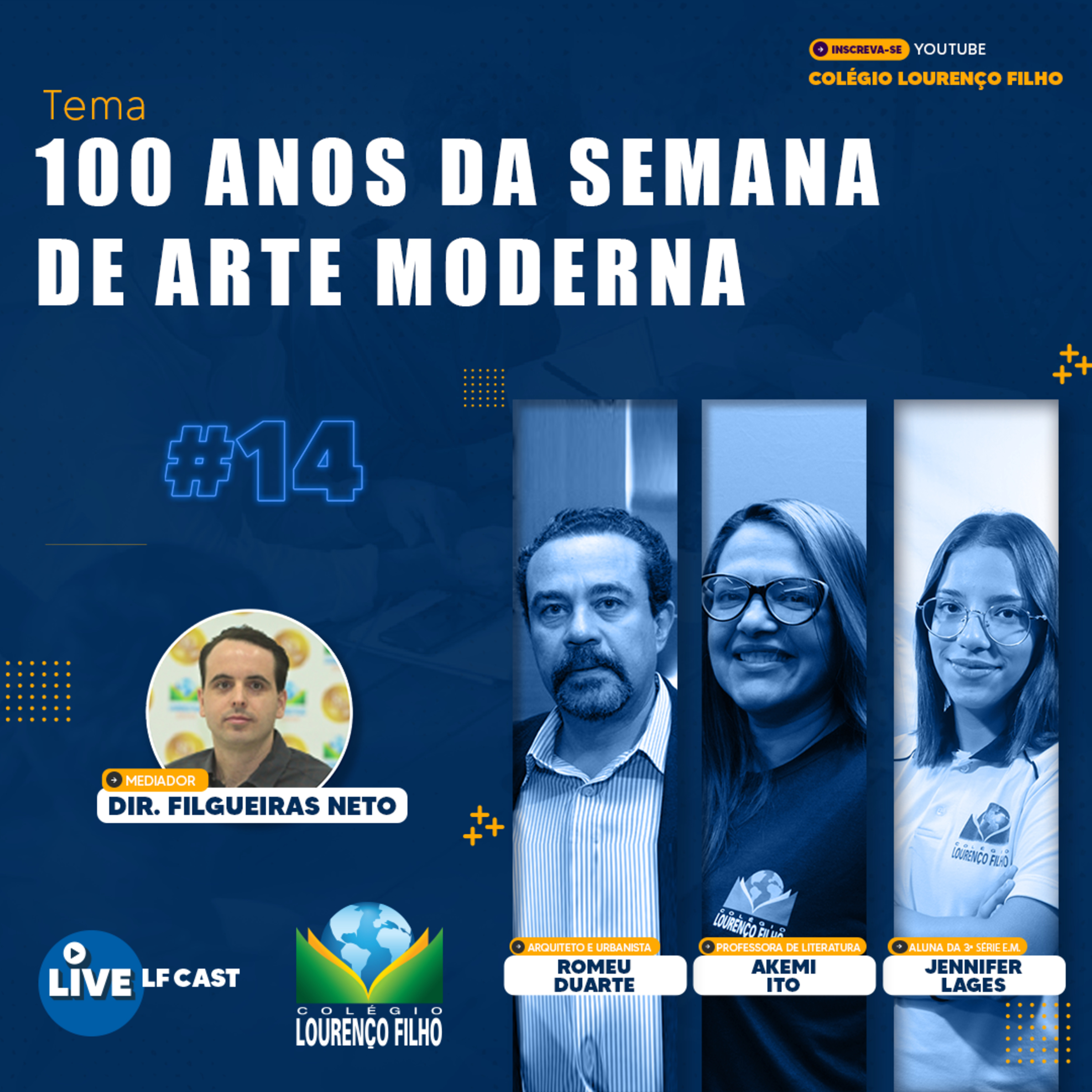 No ano que comemoramos os 100 anos da Semana de Arte Moderna, um marco para a literatura brasileira, não poderíamos deixar de abordar este tema em um podcast com convidados especiais. Neste dia recebemos o Arquiteto e Urbanista Romeu Duarte, acompanhado da Profa. Akemi Ito e mediados pelo Diretor Filgueiras Neto para um papo leve e repleto de informações importantes. Também recebemos, como convidada, nossa aluna Jennifer Lages representando os alunos do colégio.