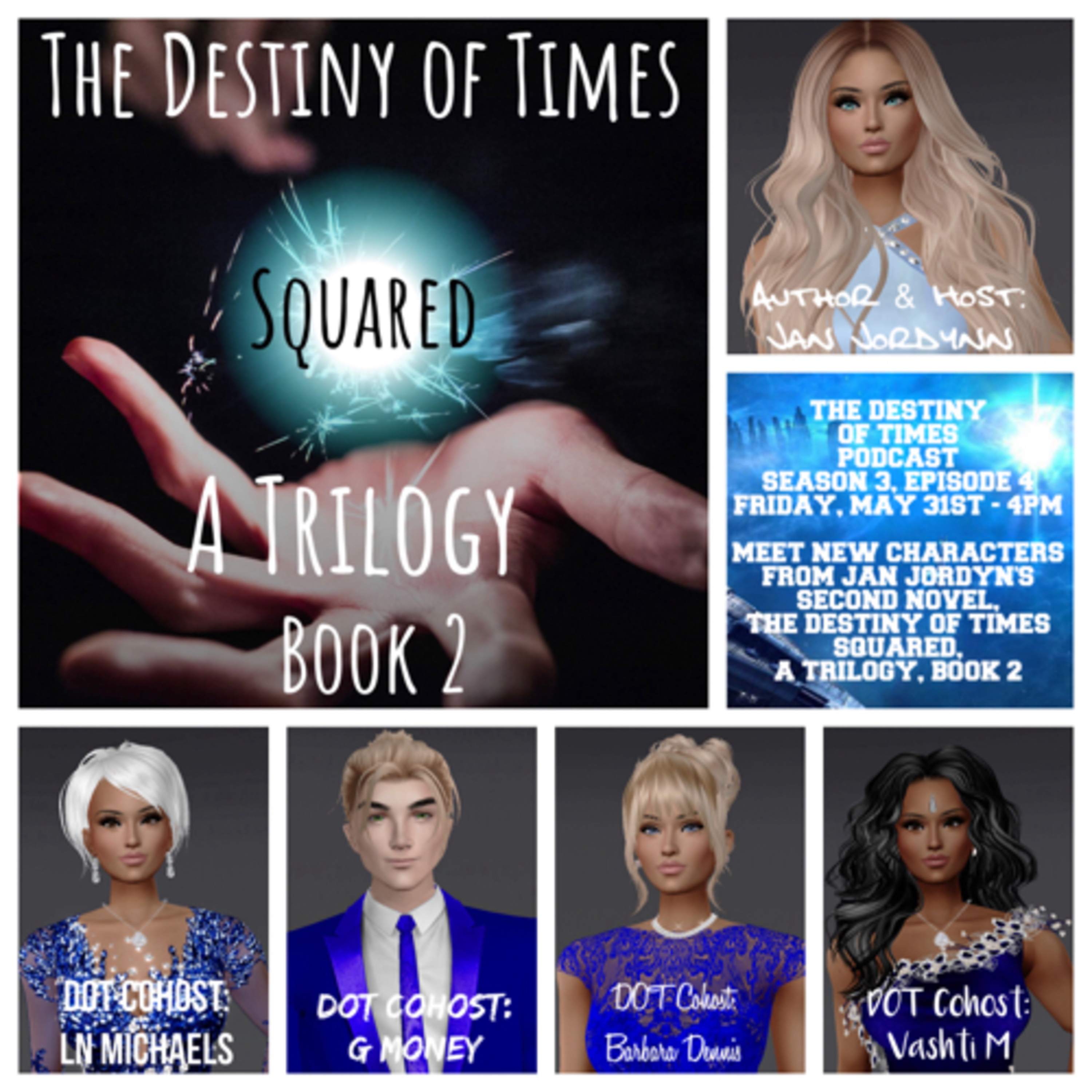 Join Host Jan Jordynn and the DOT Creative Team for The Destiny of Times Podcast on Friday, May 31st at 4pm as they continue to introduce new characters and share details from Jan’s second novel, The Destiny of Times Squared, A Trilogy, Book 2.