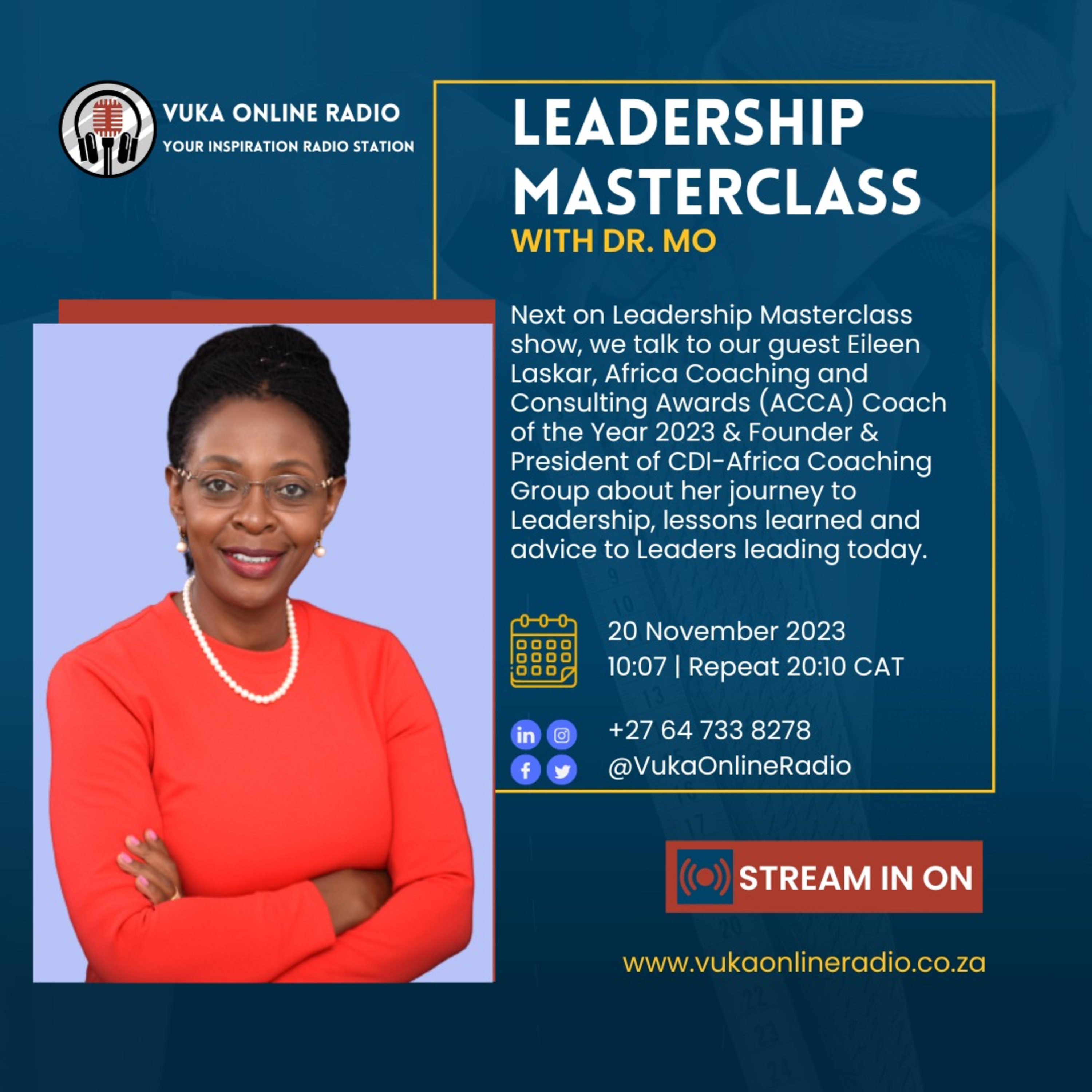 On Leadership Masterclass show, we talk to our guest Eileen Laskar, Africa Coaching and Consulting Awards (ACCA) Coach of the Year 2023 & Founder & President of CDI-Africa Coaching Group about her journey to Leadership, lessons learned and advice to Leaders leading today.