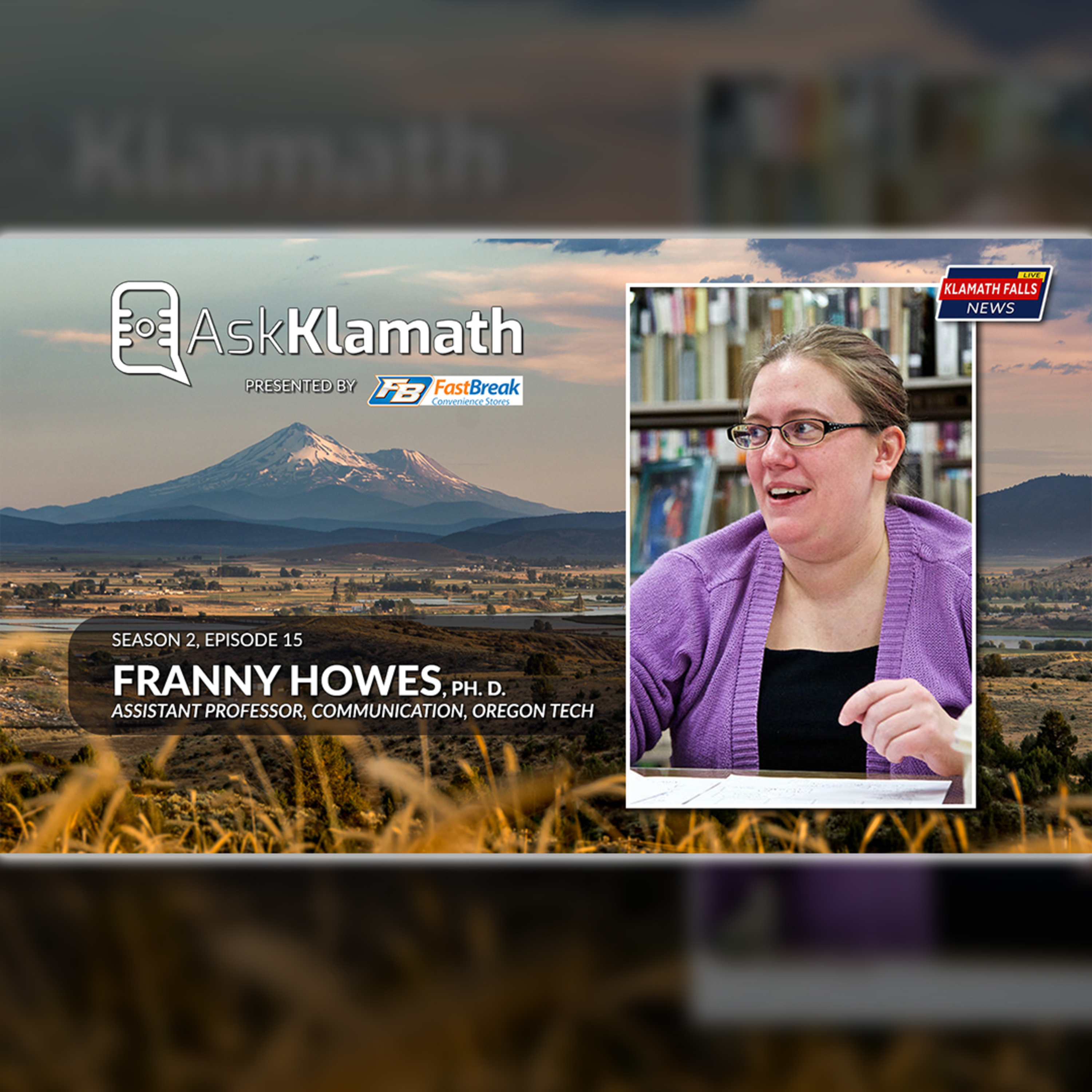Franny Howes, Assistant Professor of Communications at Oregon Tech is our guest on Season 2, Episode 15 of Ask Klamath. In this episode, we chat with Franny about the communication program at Oregon Tech, future of the coms program, cartoons, and answer your questions live.