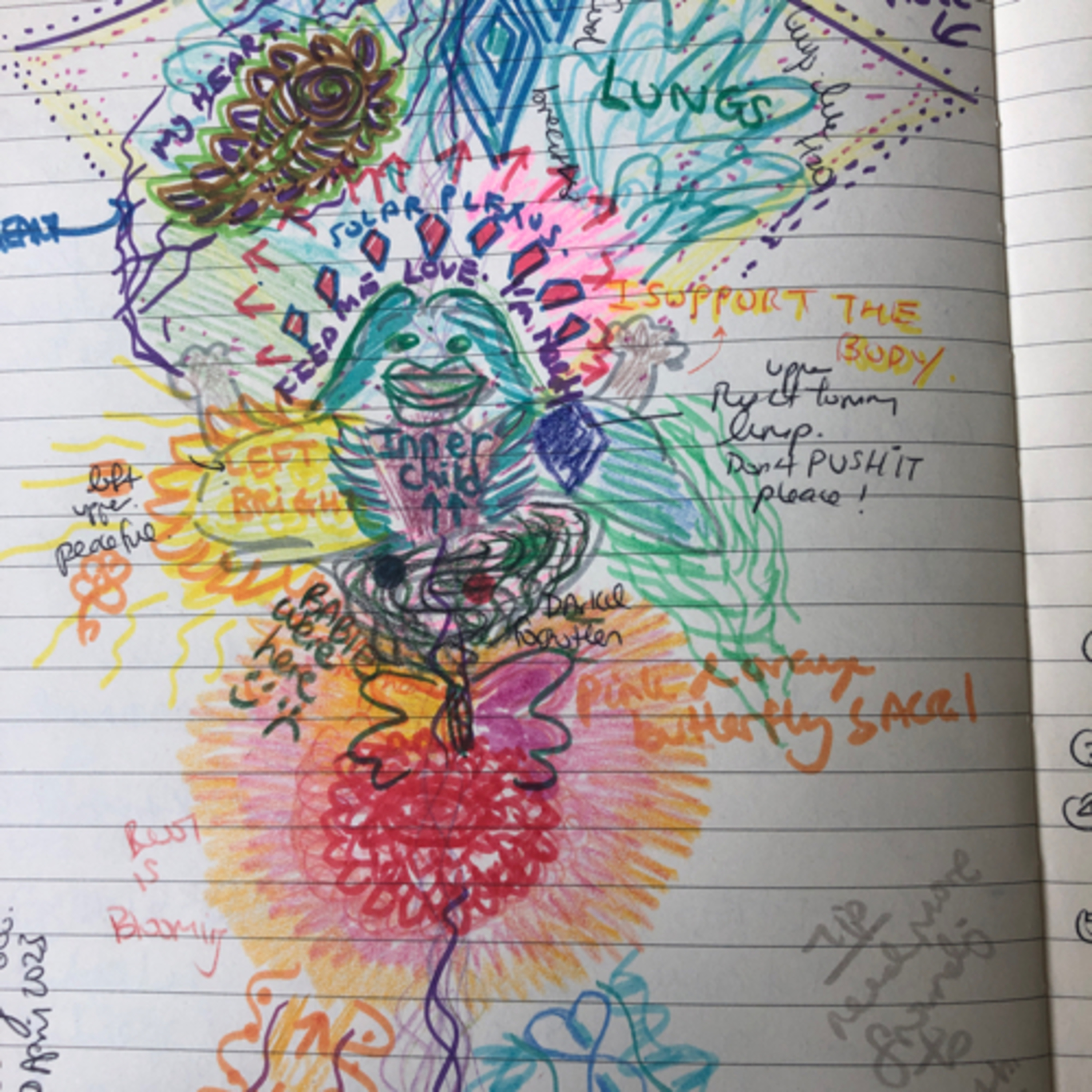 This exercise is my intuitive drawing of my body as I feel it …and showing me messages that allowed my body deeper subconscious to communicate back to my mind . Good takeaways ;)