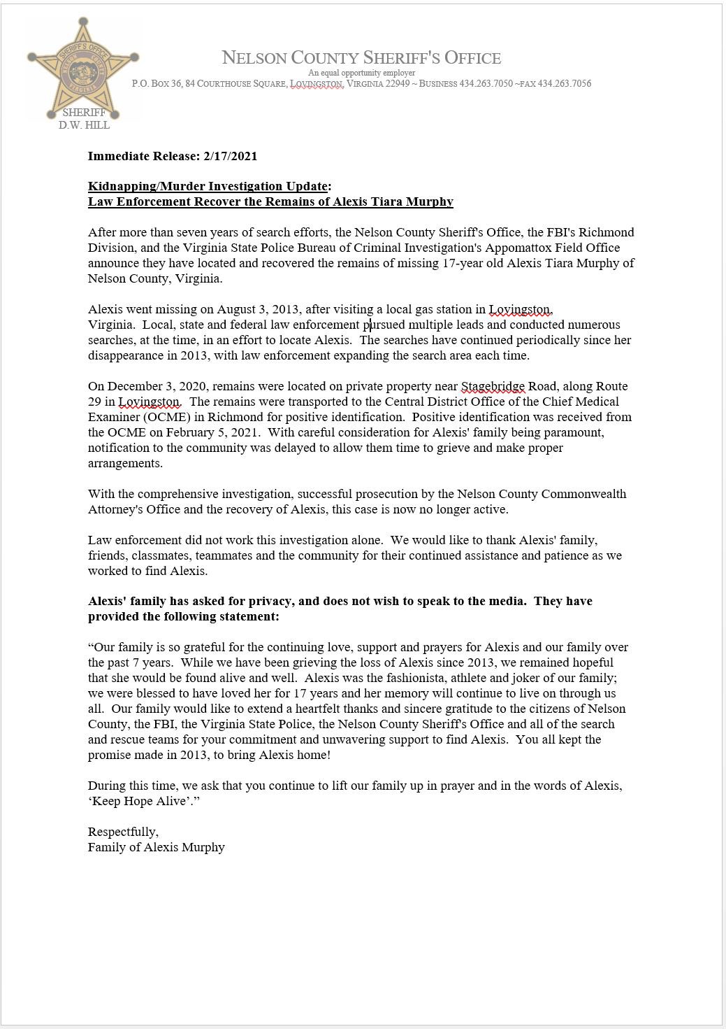 Remains of Nelson County teen Alexis Murphy found seven years after her murder (wsls.com)