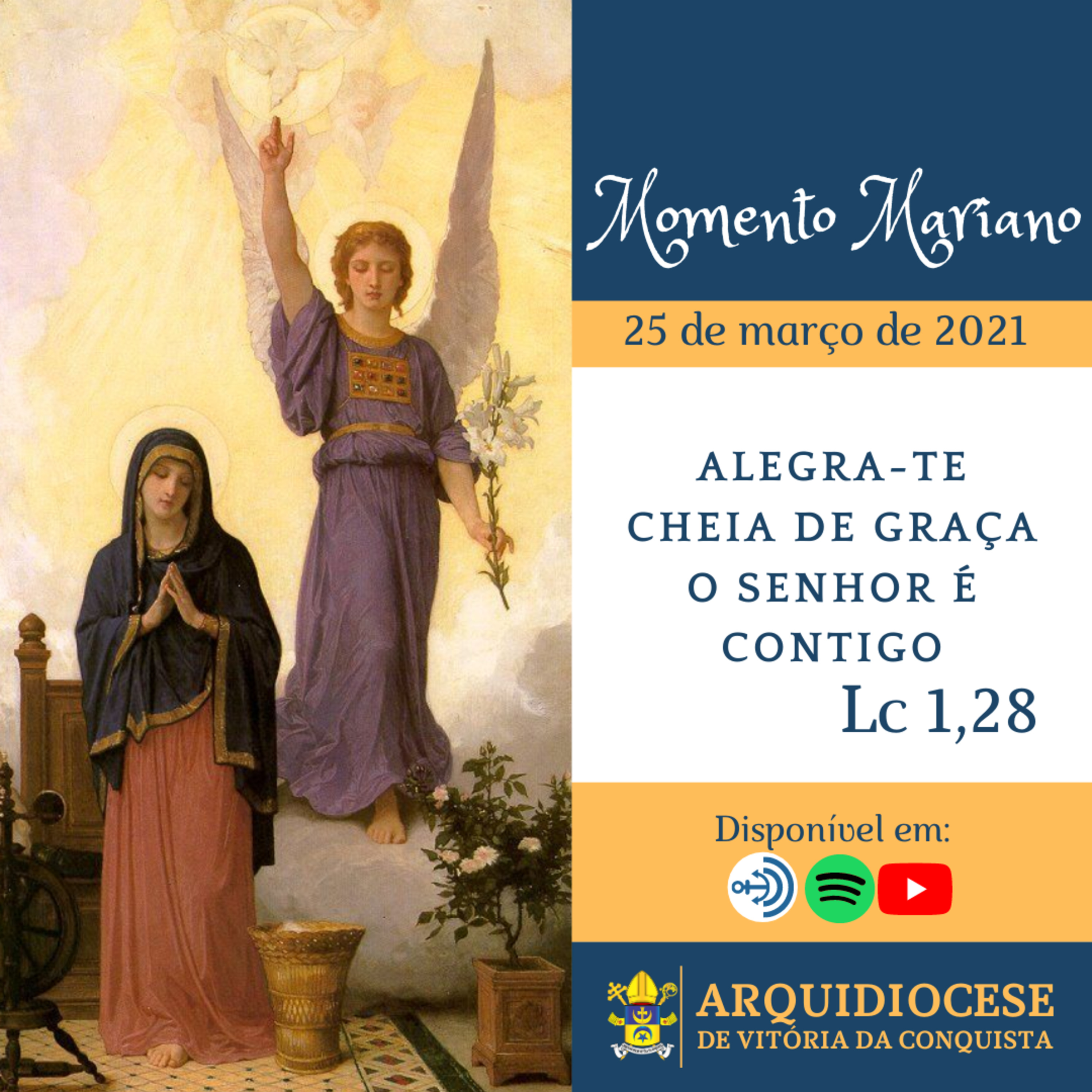 No Momento Mariano dessa quinta-feira, 25 de março, comemoramos a Anunciação do Anjo a Virgem Maria, Ela, que desde toda a eternidade foi preservada do Pecado Original para ser a Mãe do Senhor, na plenitude dos tempos, disse seu sim à obra salvífica; “Eis aqui a serva do Senhor; faça-se em mim segundo a tua palavra!” Acompanhe: Youtube: https://youtu.be/4aCAvFmD6O8 Anchor: https://anchor.fm/dashboard/episodes Spotify: https://cutt.ly/bhKJa8t