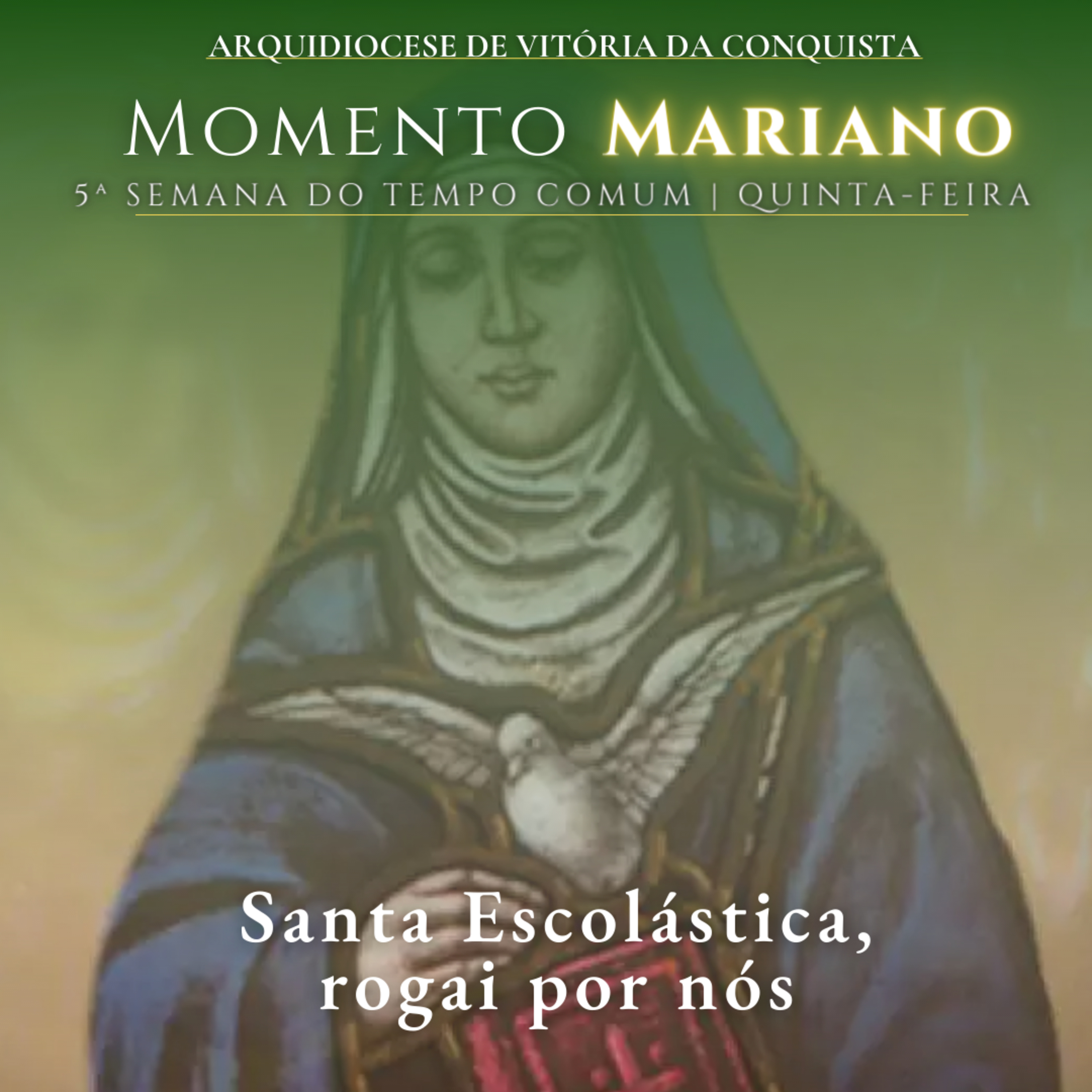 Santa Escolástica, pressentindo que não voltaria a ver mais seu irmão, pediu-lhe que ficasse com ela para ter diálogos espirituais, nessa noite. São Bento lhe disse, que não podia, por ter que cumprir a Regra que ele próprio escrevera (o que, no caso, significava que ele não deveria se ausentar por mais tempo do próprio mosteiro); então, a santa chorou e rezou, e começou uma tempestade tão violenta que obrigou São Bento a ficar e passar a noite com a irmã, tendo colóquios espirituais. Três dias depois, a santa morreu e seu irmão, que estava envolvido em oração, teve a visão da alma de sua irmã ascendendo ao céu em forma de pomba. Veja mais, em: Youtube: https://youtu.be/FFOjA6N0ELM