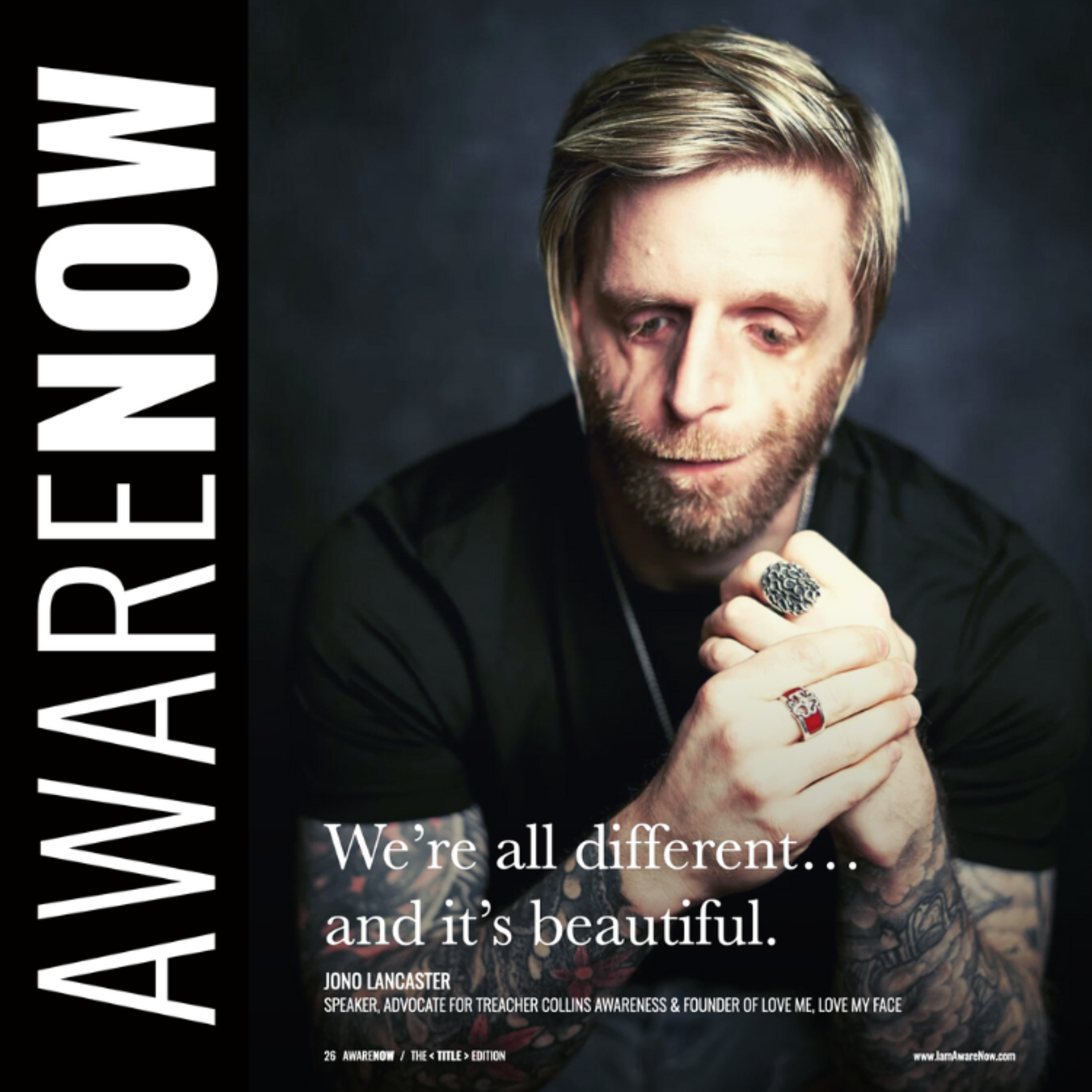 A lad from West Yorkshire spreading a little bit (a lot a bit) of love into the world, Jono Lancaster was born with Treacher Collins Syndrome, a rare congenital disorder that caused his facial bones to develop in an asymmetrical way. Jono has dedicated his life to helping others who look different know they are not alone and that they are loved.