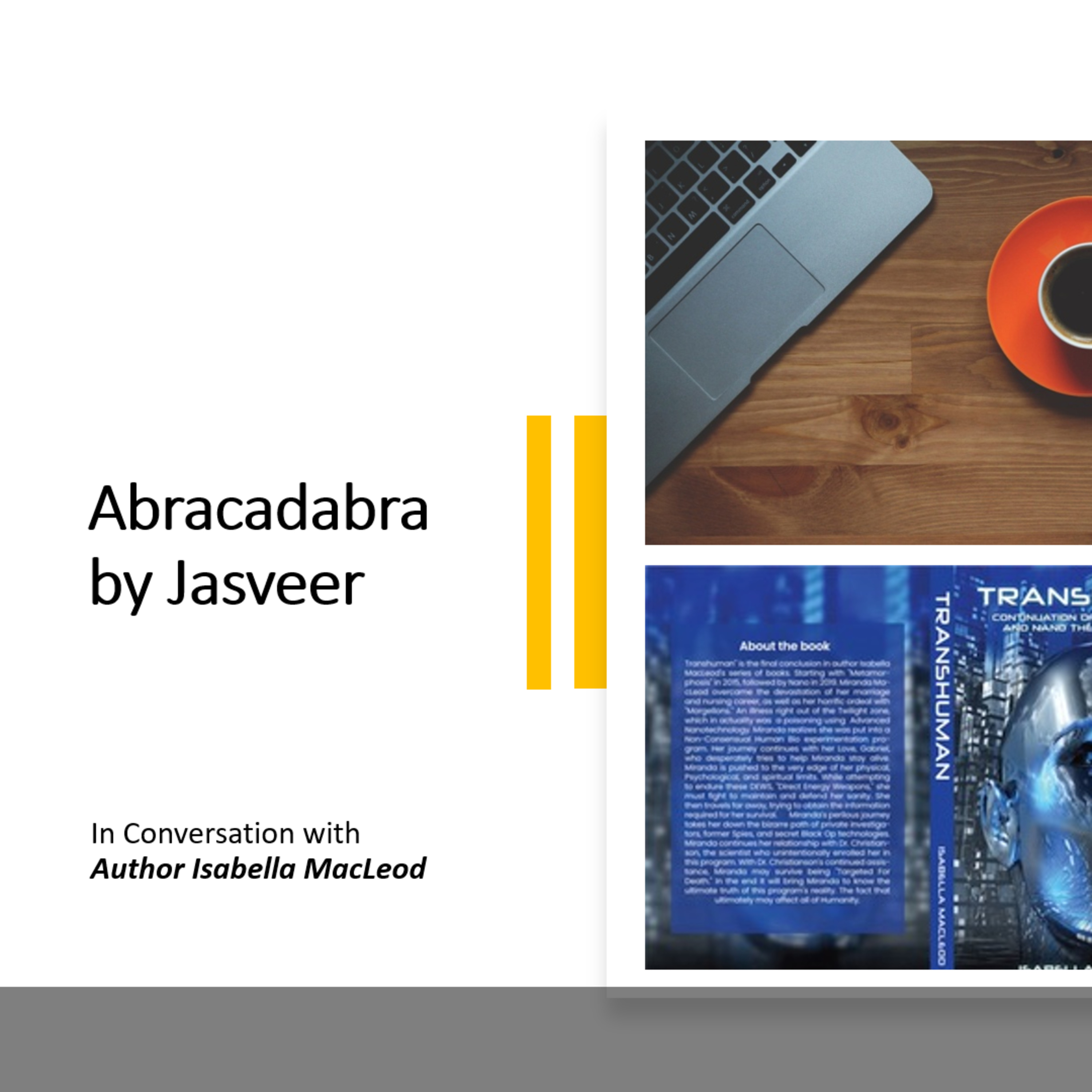 A delightful conversation with Isabella MacLeod, Author & Wellness expert from Nova Scotia, Canada. This is second time for Isabella on Abracadabra. Her earlier works include Metamorphosis, and Nano. She also co-authored the best seller Guide to Complete Self-Care: 25 Tools for Happiness under Anna Pereira the founder of The Wellness Universe.