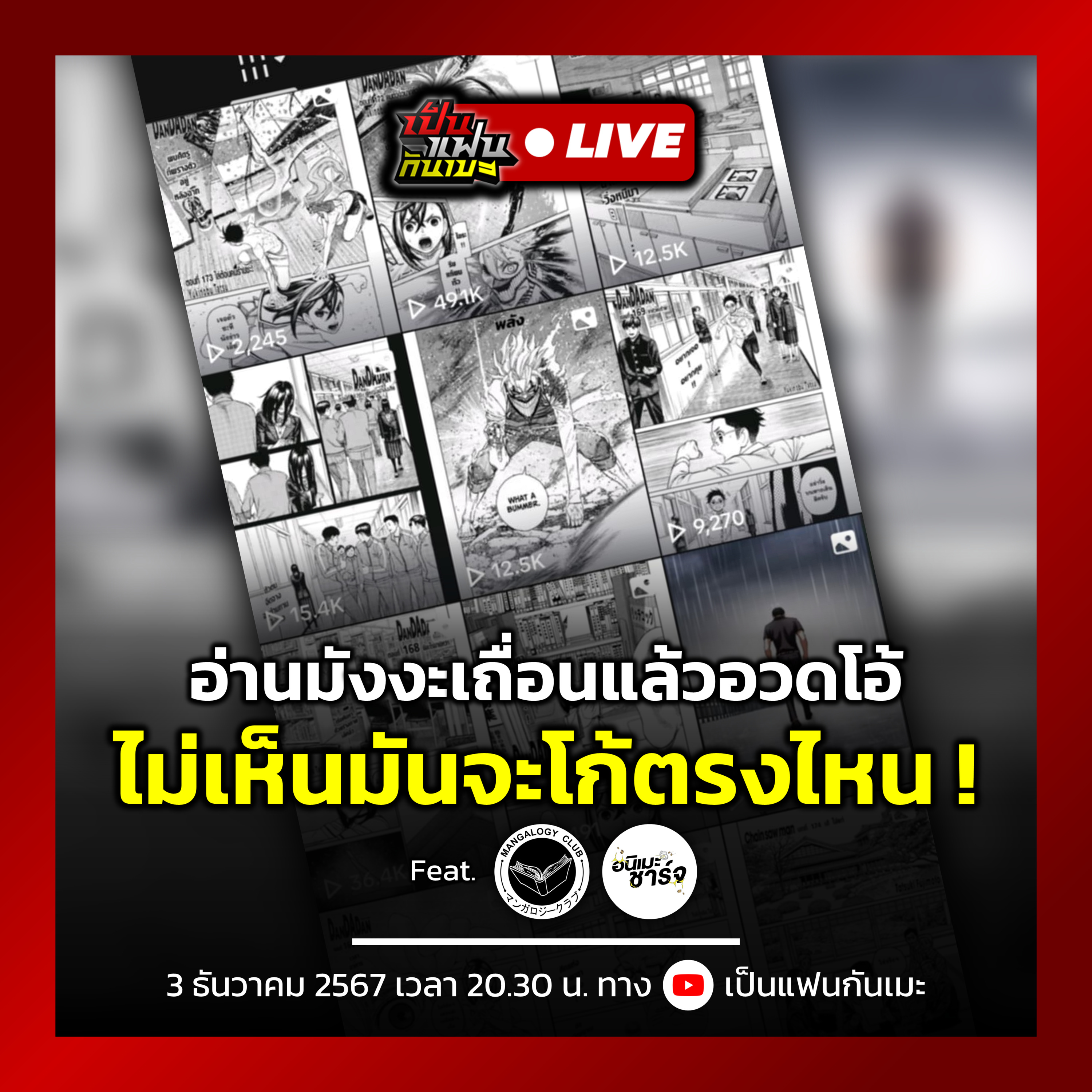 เปิดประเดิม "เป็นแฟนกันเมะ LIVE" รายการสดรายเดือนของเรา ด้วย 2 อินฟลูเอนเซอร์ "MangalogyClub - อนิเมะชาร์จ" และ 1 นักแปลมังงะ ที่จะมาเผยความคิดเห็นต่อเรื่องราวนี้ ในหัวข้อ "อ่านมังงะเถื่อนแล้วอวดโอ้ ไม่เห็นมันจะโก้ตรงไหน !"