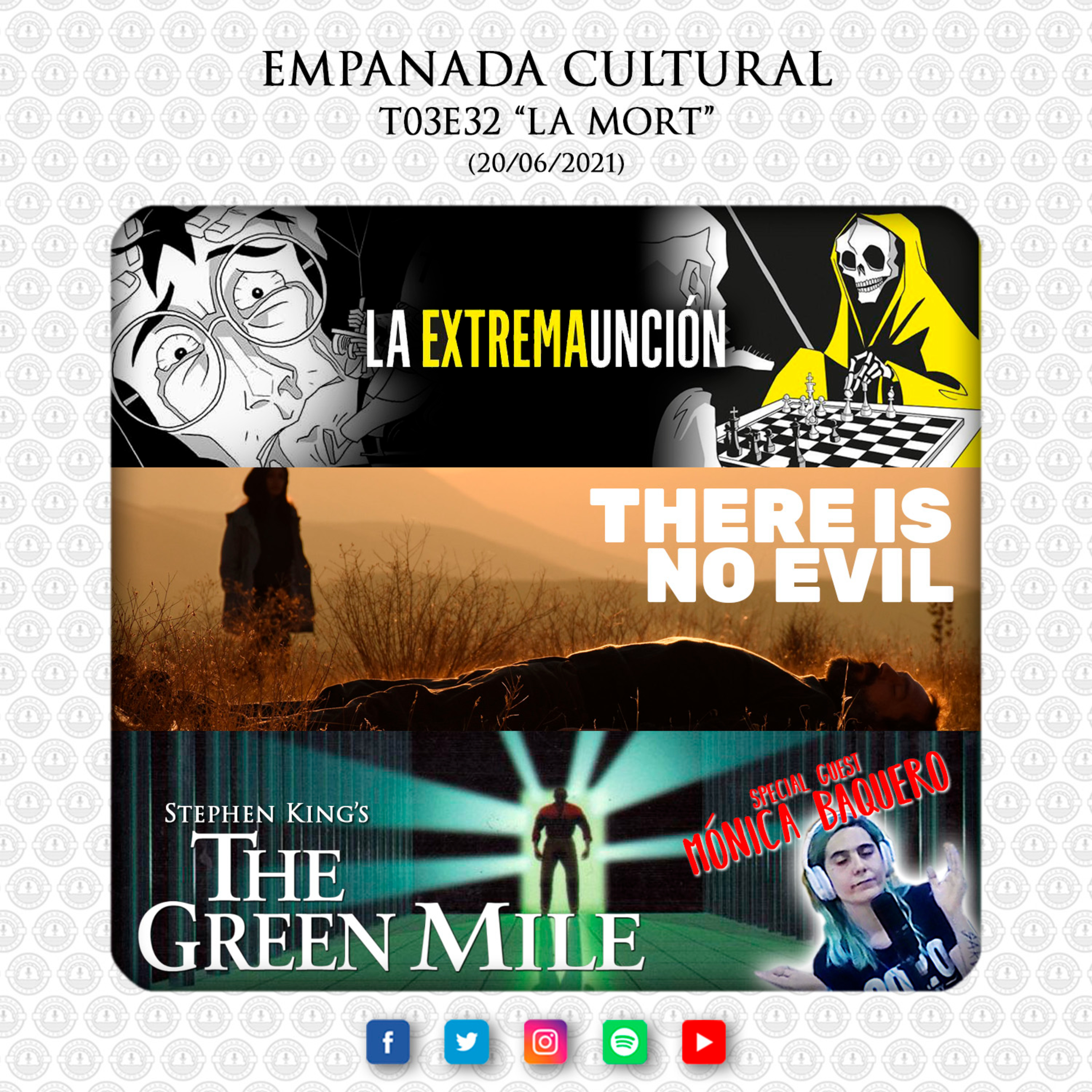 Ens intentem posar seriosos per parlar de La Mort... i no ens en sortim... En Pol ens proposa el còmic "La Extremaunción" d' Oriol de la Torre i Albert Mañosa, on un capellà dubtós i un humorista arrepentit conversen durant els últims moments del darrer. L'Adriano ens recomana la pel·lícula "There is no Evil" de Mohammad Rasoulof, on es narra la dura realitat iraní sobre la pena de mort. I la nostra convidada especial, Mónica Baquero, ens parla del llibre "The Green Mile (La Milla Verde)" del prolífic Stephen King, i com en ell es veuen diferents maneres d'encarar la mort.
