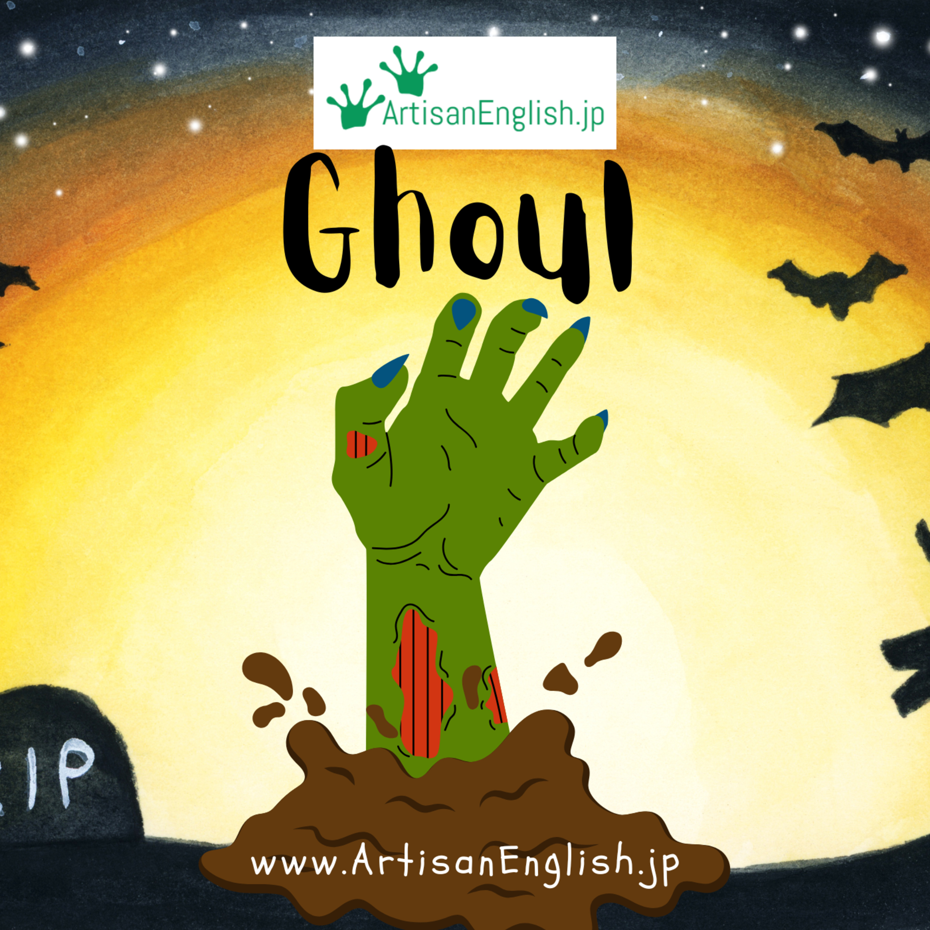 Ghoul: A ghoul is a mythical creature from Arabic folklore. A ghoul is an evil spirit or monster found in graveyards that eats dead bodies. https://links.artisanenglish.jp/Ghoul
