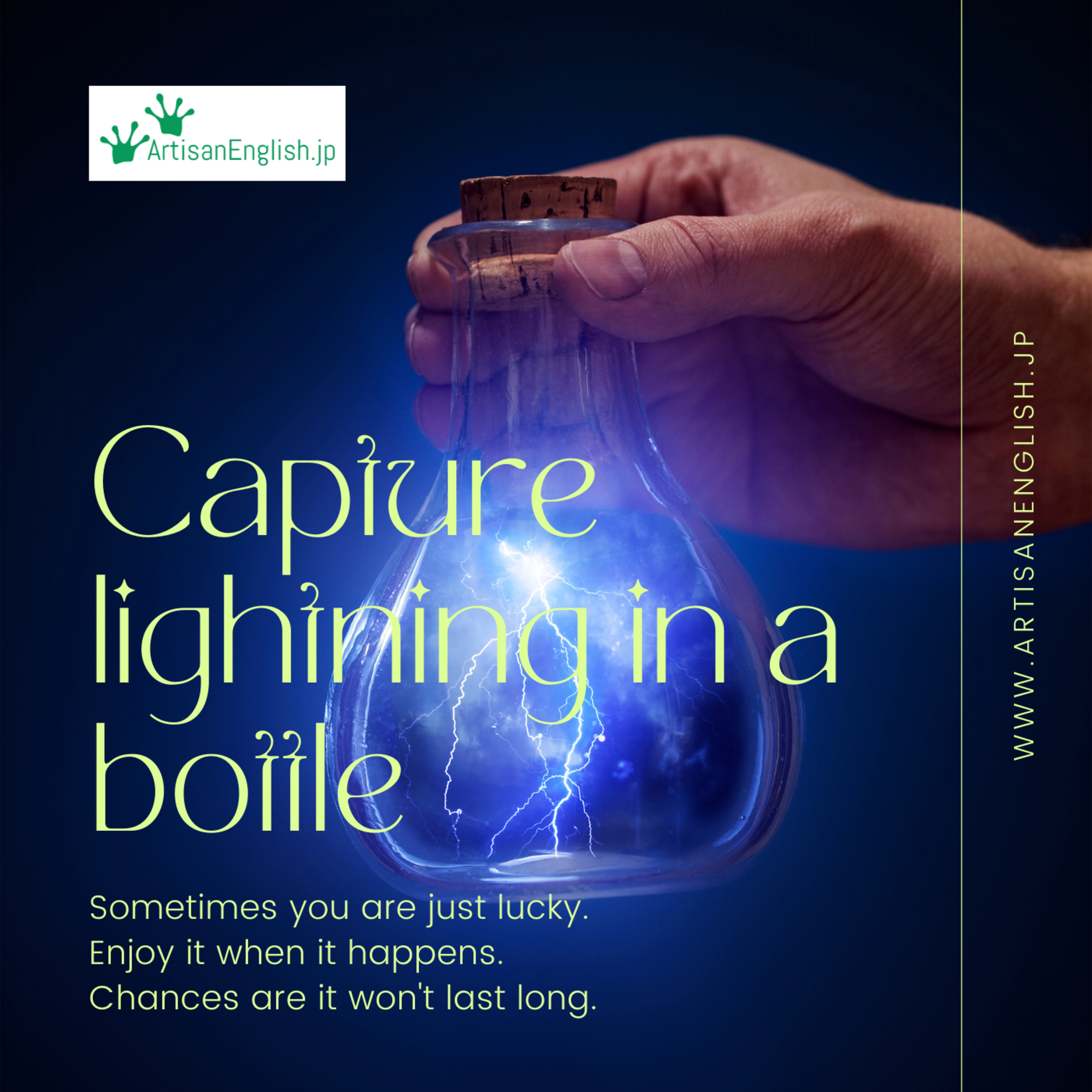 This episode was published on Thursday, December 2, 2021. Today our idiom is ‘capture lightning in a bottle.’ To capture lightning in a bottle means to be very lucky and achieve success especially in something is extremely difficult or unlikely. You can read along as you listen by clicking HERE or by copying and pasting this link into your preferred browser: https://links.artisanenglish.jp/CaptureLightningInABottle