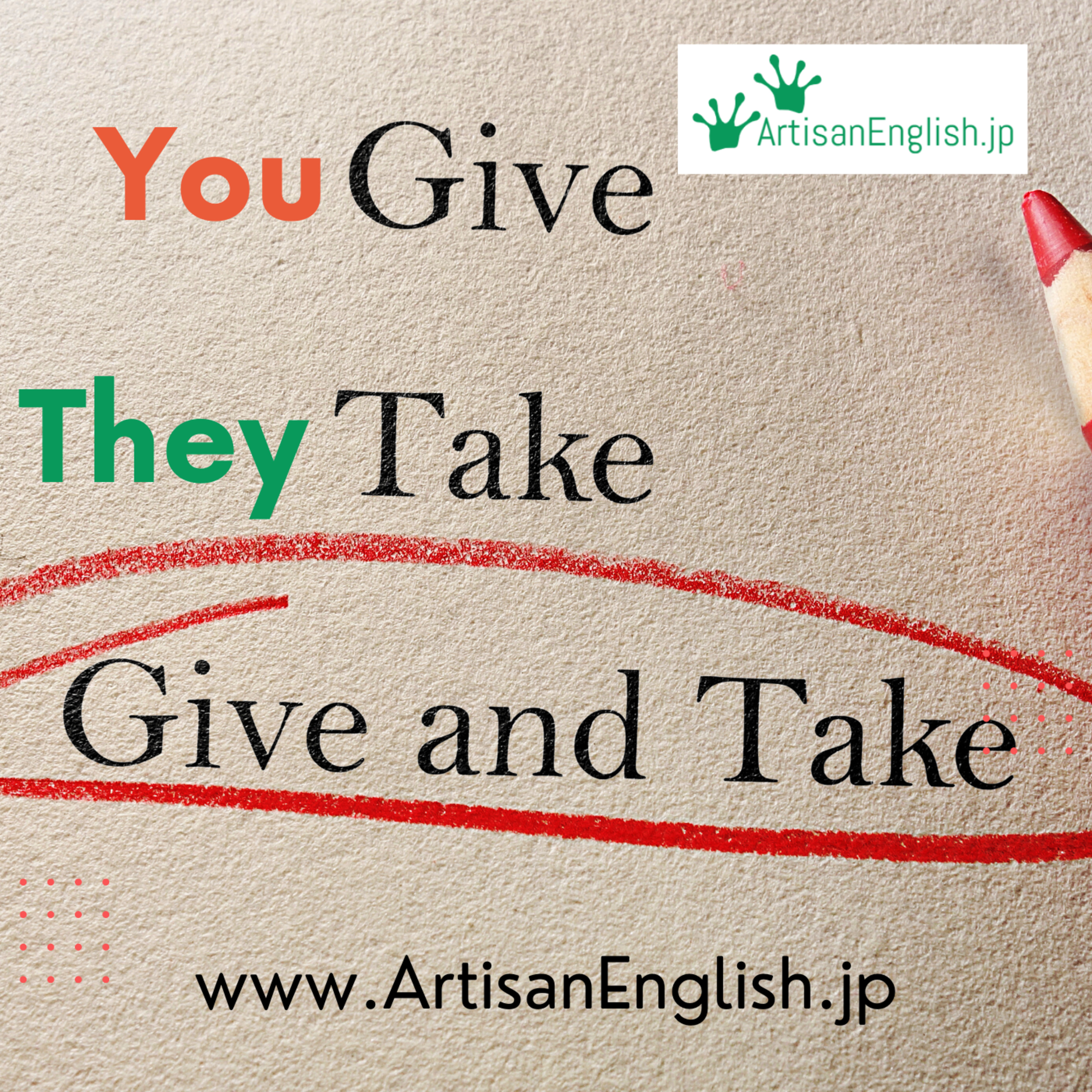 Give and take: Give and take refers to the never-ending negotiation of mutual concessions and comprises that make up most of life. https://links.artisanenglish.jp/GiveAndTake