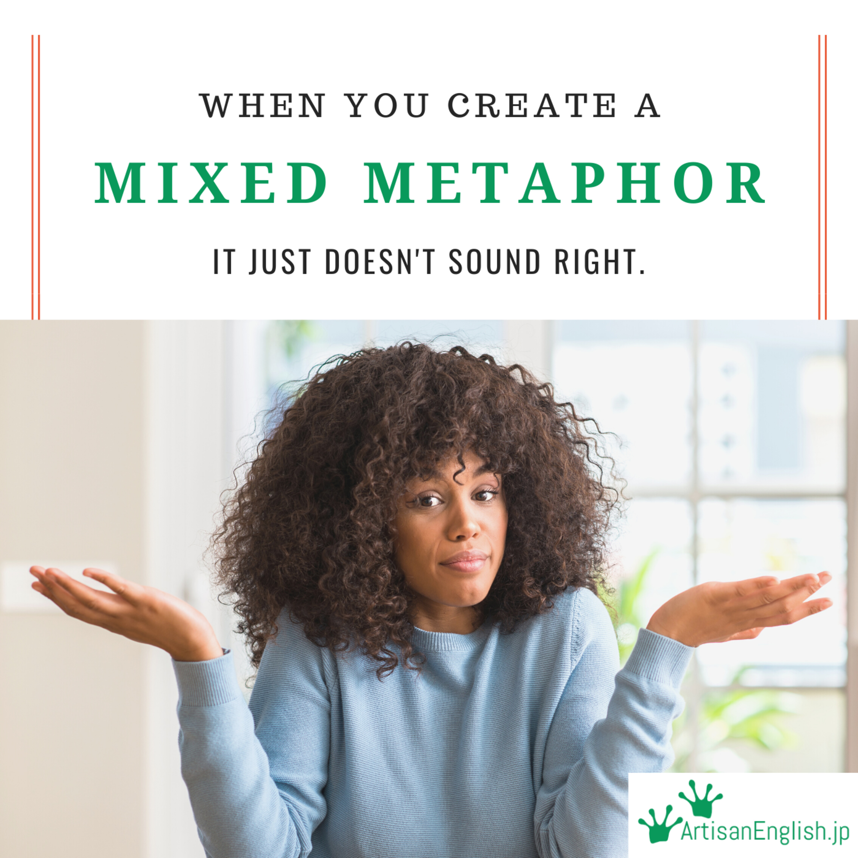 Today’s episode is for Thursday, May 27, 2021. Our Word of the Day is ‘mixed metaphor.’ We have a mixed metaphor when someone uses two or more incompatible metaphors together. Often this mixing sounds foolish or funny. You can read along as you listen by clicking HERE or by copying and pasting this link into your preferred browser: https://links.artisanenglish.jp/MixedMetaphor