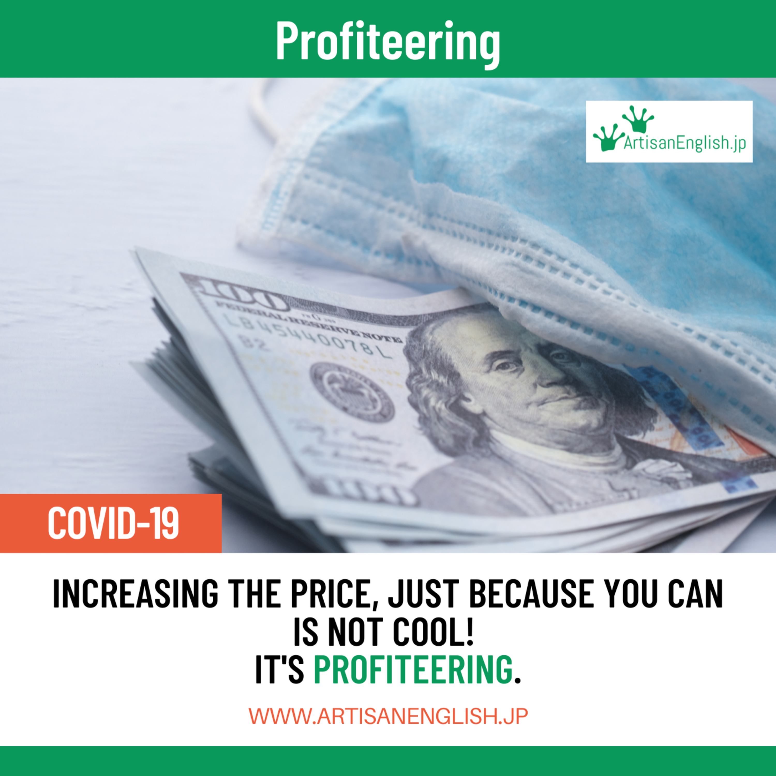 Today’s episode is for Sunday, January 31, 2021. Our Word of the Day is ‘profiteering.’ Profiteering is making excessive profits from people who are in a bad situation and perhaps making their situation even worse. You can read along as you listen by clicking HERE or by copying and pasting this link into your preferred browser: https://www.artisanenglish.jp/debate-and-discussion-online/profiteering/