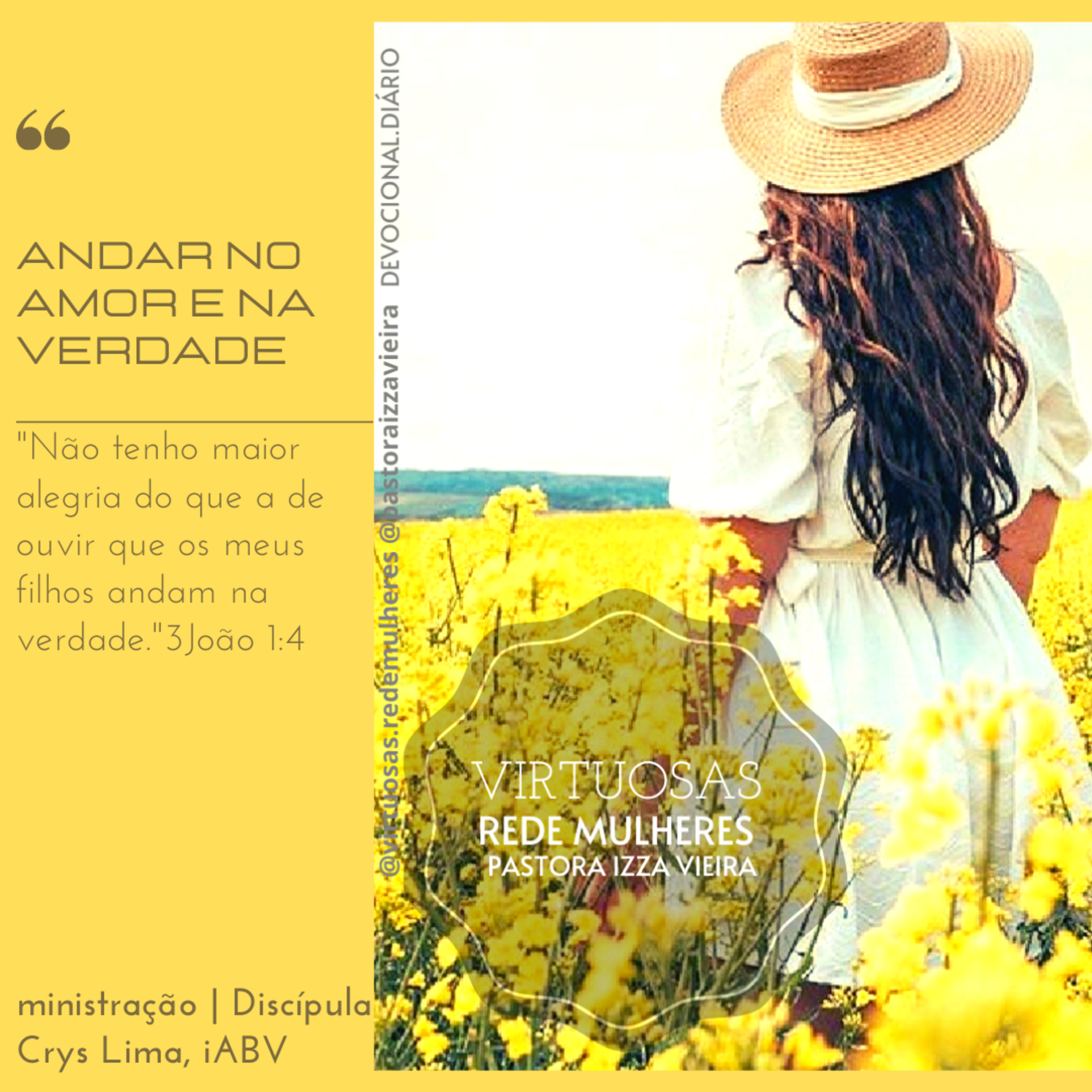 Bom dia Virtuosas! O Amor do Senhor nos cerca e nos conduz...Ele nos chama a andarmos no Seu Amor e na Verdade...minha Discípula Crys Lima fala desse Amor que É o Caminho, vivemos nEle e nos movemos nEle.