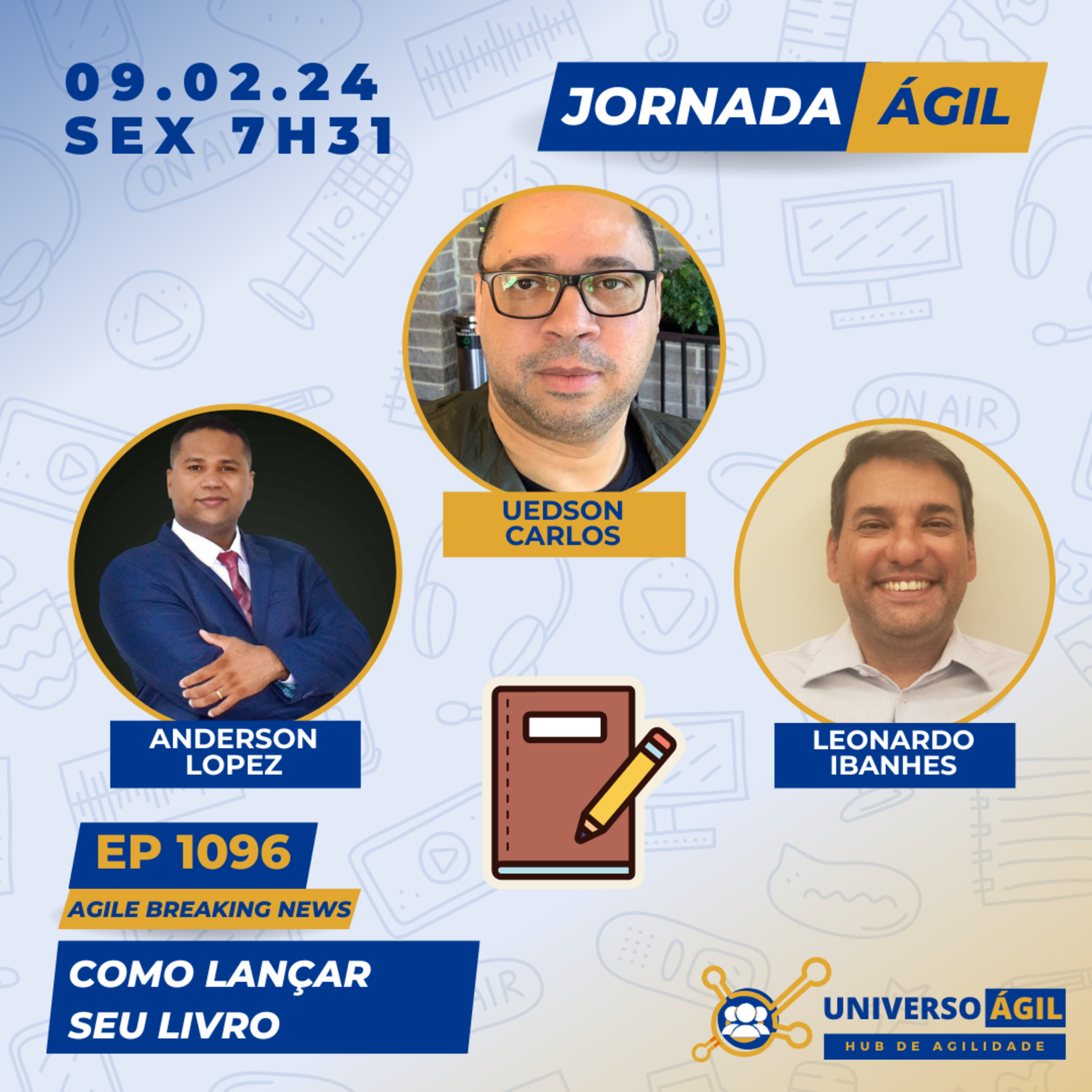 🚀 O quadro #JornalAgil de sexta-feira 09.02.24 7h31 (horário Brasília) no programa #JornadaÁgil traz Uedson Carlos @uedsoncarlos, Leonardo Ibanhes e Anderson Lopez @professorandersonlopez para debater sobre como lançar seu livro
