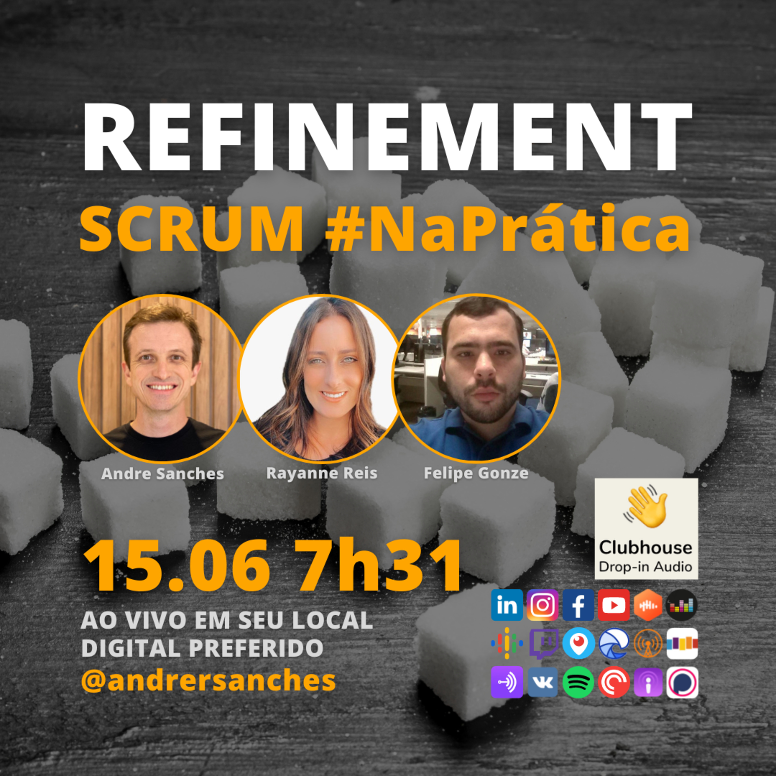 Nesta terça-feira 15.06.21 às 7h31 (horário de Brasília, Brasil) o #JornadaÁgil731 traz os Scrum Masters Rayanne Reis @rayannemreis, Felipe Gonze @felipegonze, Andre Sanches @andrersanches, convidados e você pro refinamento desta troca de conhecimentos sobre o refinamento do product backlog.