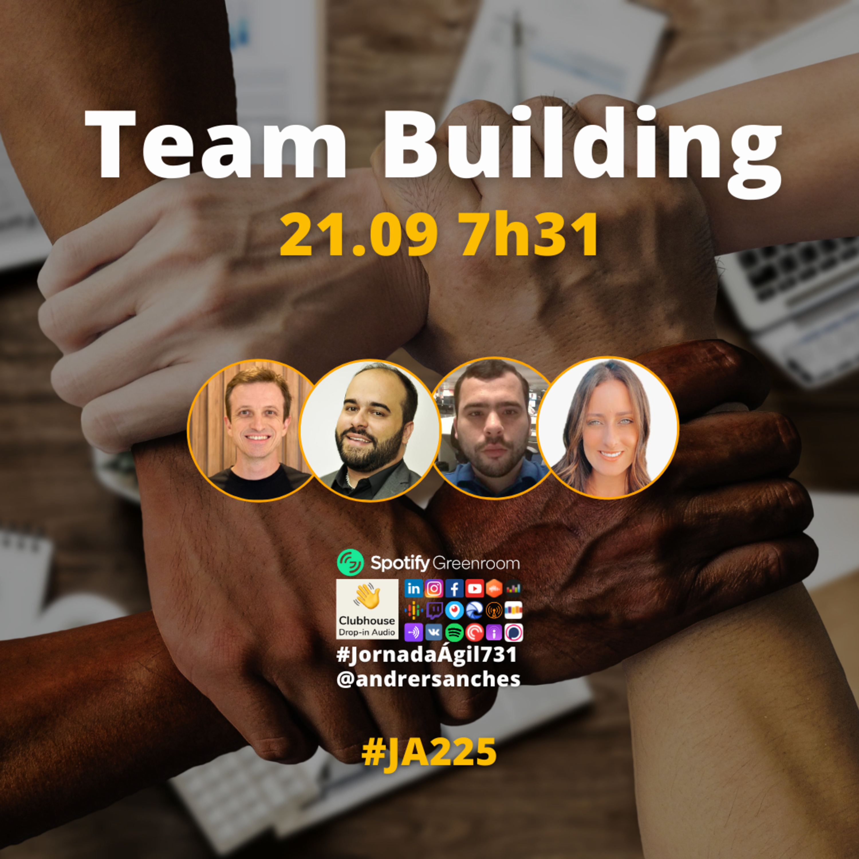 Nesta terça-feira 21.09.21 7h31 (horário Brasília) #JornadaAgil731 traz Rayanne Reis @rayannemreis, Felipe Gonze @felipegonze, Fábio Baldin @fabiobaldin, Andre Sanches @andrersanches e convidados pra debater com #Agilidade como o team building colabora para integração entre colegas, elevando a produtividade.