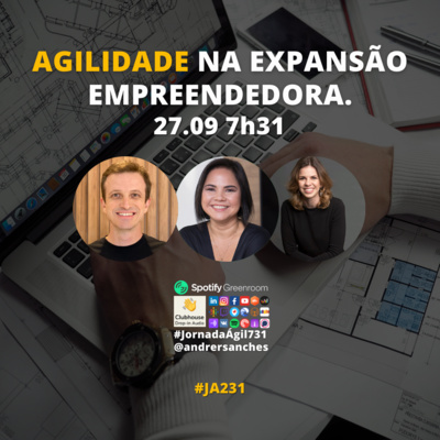 Segunda-feira 27.09.21 7h31 (horário Brasília) #JornadaAgil731 traz Andre Sanches @andrersanches, Rebeca Toyama @rebecatoyama, Marcela Viana @marcelamvcosta e convidados para construir com você, como realizar uma expansão empreendedora de forma #ágil.