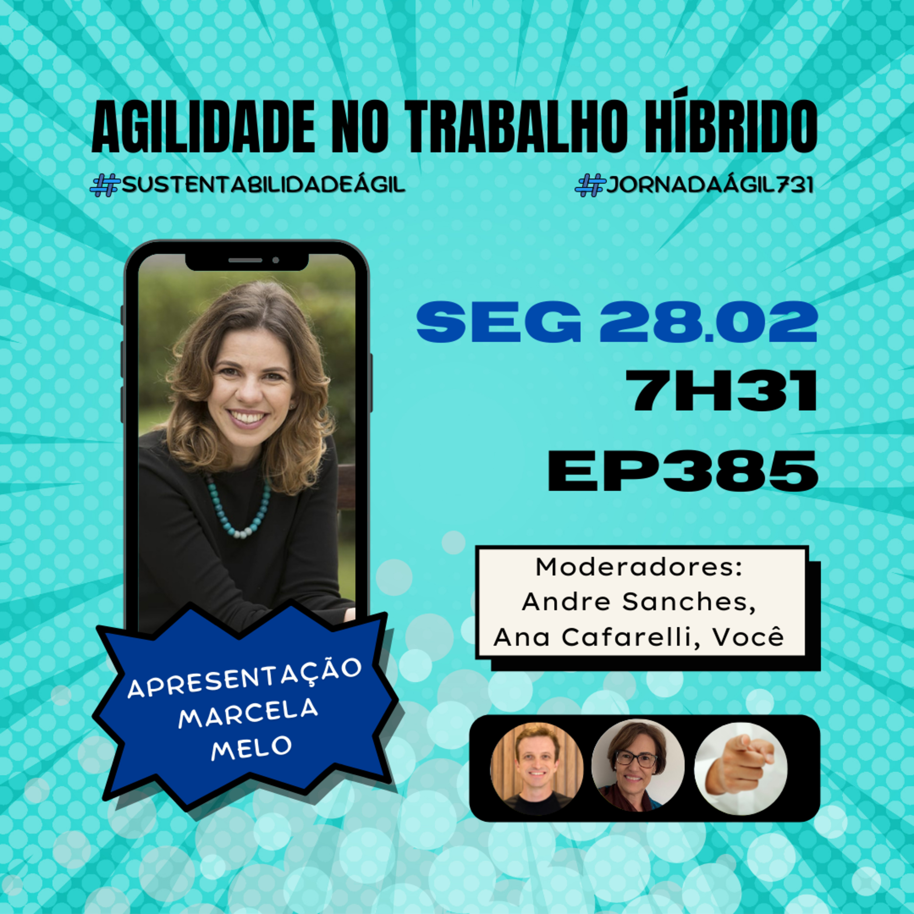 O quadro #SustentabilidadeAgil Segunda-feira 28.02.22 7h31 (horário Brasília) do programa #JornadaAgil731 traz a apresentadora Marcela Melo @marcelamvcosta, as pessoas moderadoras/curadoras Andre Sanches @andrersanches e convidadas especiais @anacafarelli.consultoria e você para debater sobre sustentabilidade e agilidade no trabalho híbrido, quais as melhores estratégias para manter a sustentabilidade em equipes híbridas, dicas ágeis para manter a saúde mental na jornada híbrida, entre outros tópicos