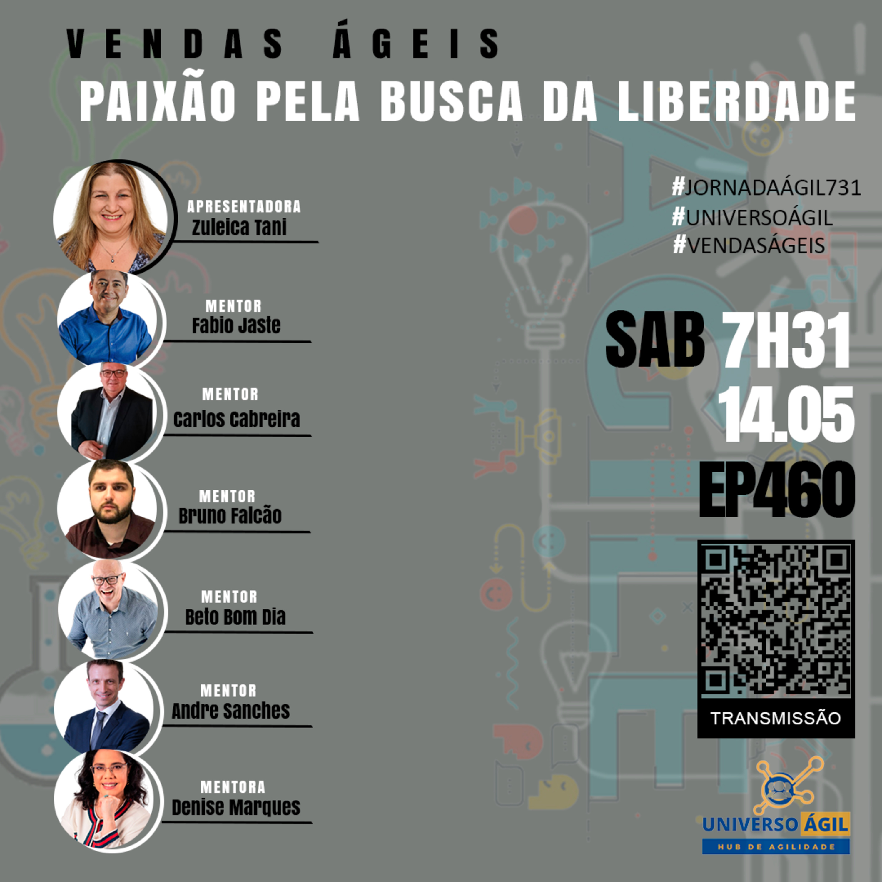 O quadro #VendasAgeis deste sábado 14.05 7h31 no programa #JornadaAgil731 traz a apresentadora Zuleica Tani @zuleicatani_oficial o convidado Fabio Jastre @fabiojastre e o seleto time de pessoas curadoras e moderadoras Denise Marques @denise_marques_oficial , ,Beto Bom Dia @betobomdia, Carlos Cabreira @carloscabreira, Bruno Falção @brunofalcaos Andre Sanches @andrersanches e você para debater, Paixão pela busca da liberdade.