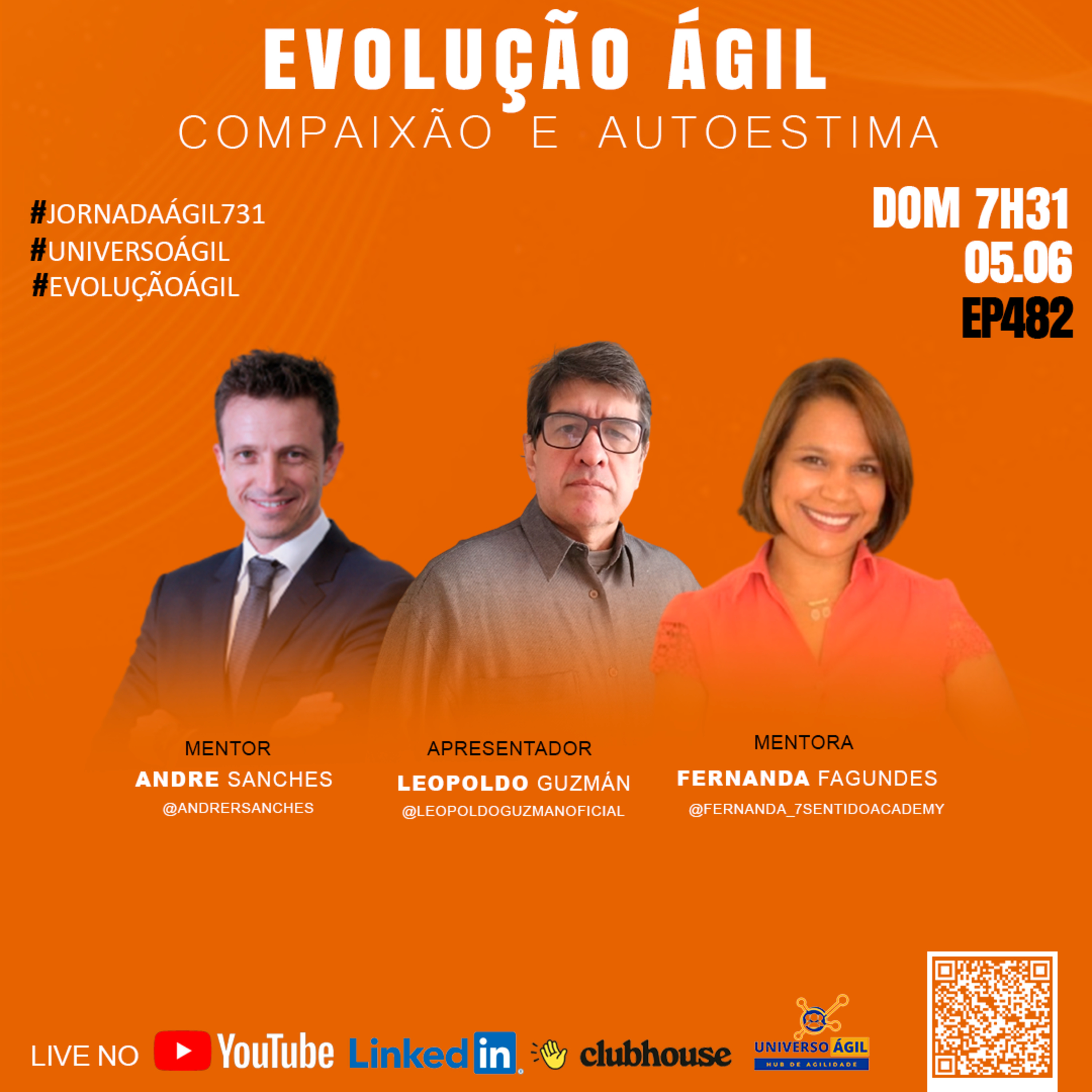 O quadro #EvolucaoAgil neste domingo 05.06 7h31 (horário Brasília) do programa #JornadaAgil731 traz o apresentador Leopoldo Guzmán @leopoldoguzmanoficial as pessoas curadoras e moderadoras Andre Sanches @andrersanches, Fernada Fagundes @fernanda_7sentidoacademy e você para um painel/debate sobre Diferença entre Empatia e Simpatia