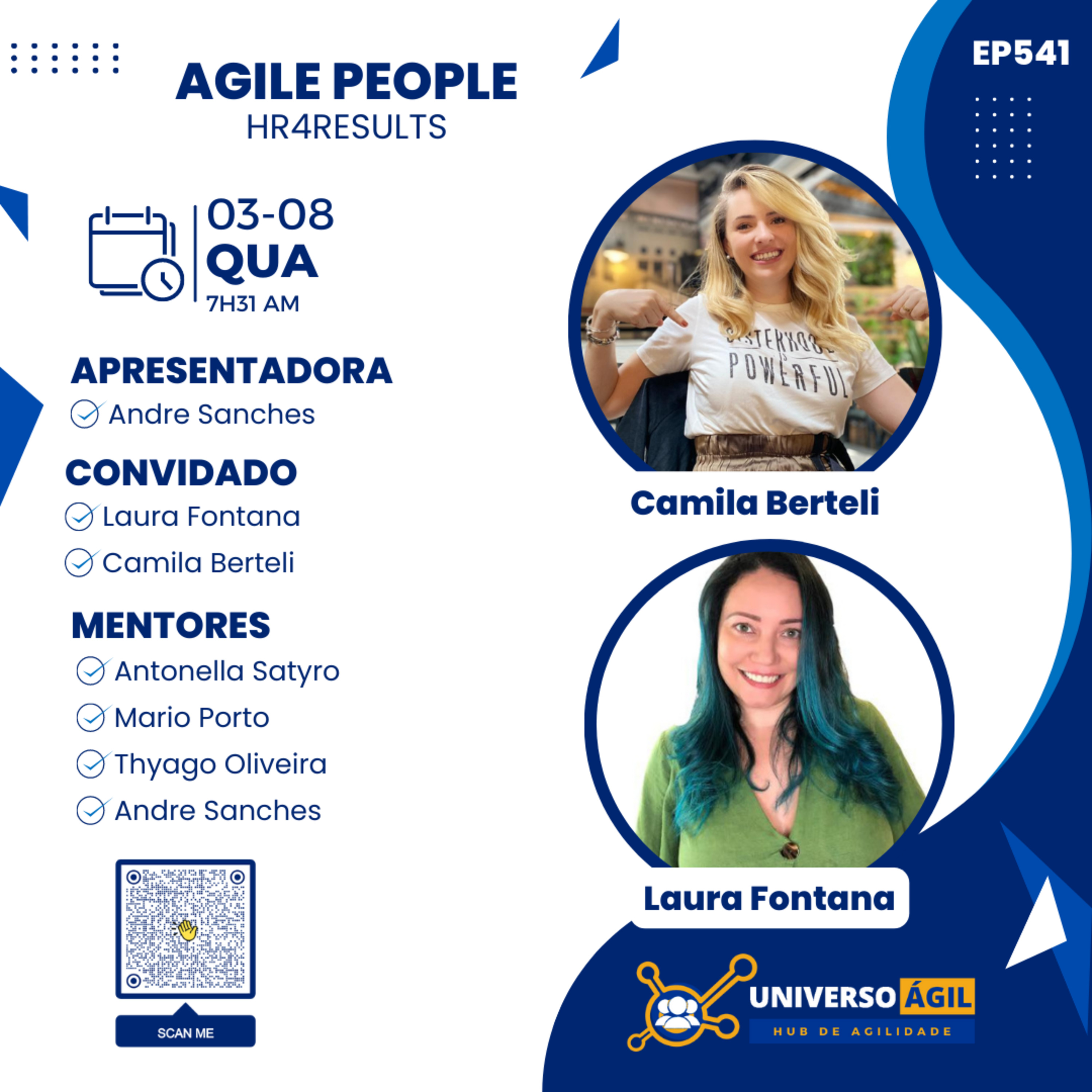 O quadro #AgilePeople #RHAgil quarta 03.08 7h31 (horário Brasília) no programa #JornadaAgil731 do #UniversoAgil traz o apresentador Andre Sanches @andrersanches as convidadas Laura Fontana @rhagilbr e Camila Bertinelli @milaberteli e as pessoas moderadoras/curadoras Thyago Oliveira, Antonella Satyro @antonellasatyro, Marcia Prado @marciapradocarneiro, Mário Porto @portomario e você para o debate HR4RESULTS