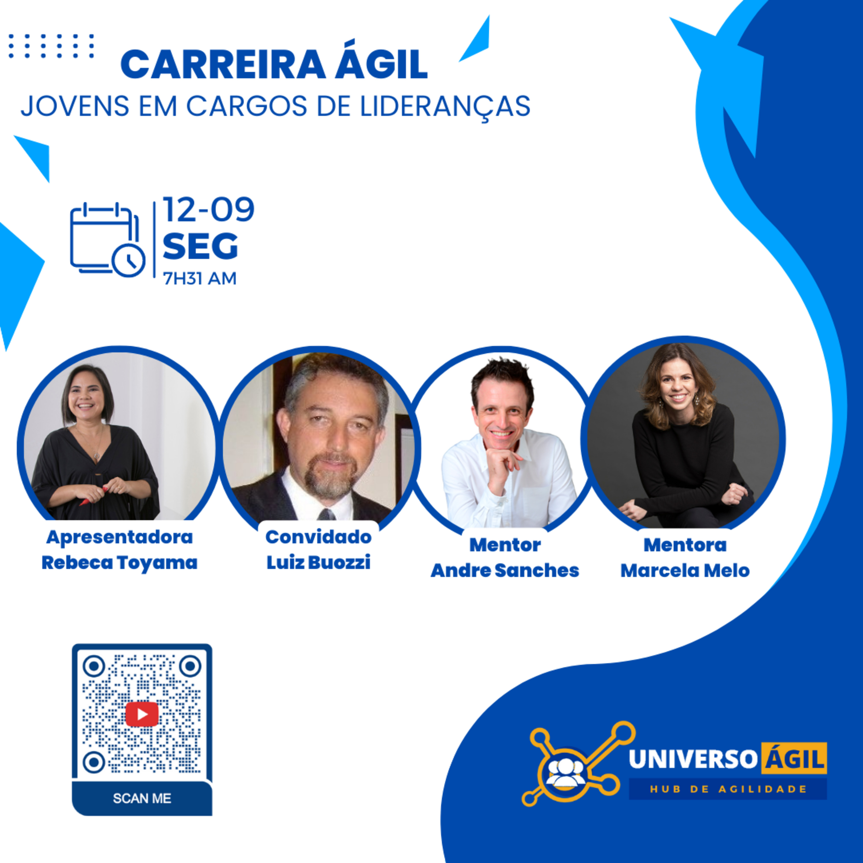 O quadro #CarreiraÁgil desta segunda-feira 12.09 7h31 (horário Brasília) do programa #JornadaAgil731 traz a apresentadora Rebeca Toyama @rebecatoyama o convidado Luiz Bouzzi @luizbuo e as pessoas moderadoras/curadoras, Andre Sanches @andrersanches Marcela Melo @marcelamvcosta e você para debater Jovens em cargos de lideranças