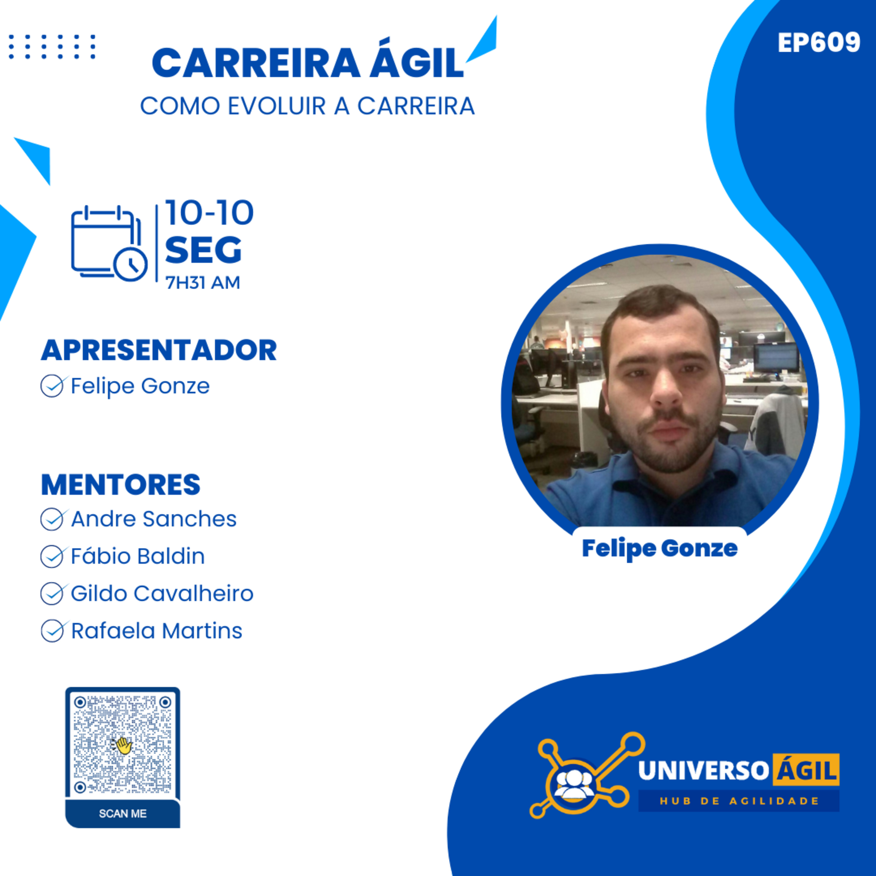 O quadro #CarreiraÁgil desta segunda-feira 10.10 7h31 (horário Brasília) do programa #JornadaAgil731 traz o apresentador Felipe Gonze @felipegonze e as pessoas moderadoras/curadoras, Andre Sanches @andrersanches, @Fabio Baldin @fabiobaldin, Rafaela Martins @oi.rafaelamartins, Gildo Cavalheiro @gildo.cavalheiro e você para debater Como evoluir a carreira
