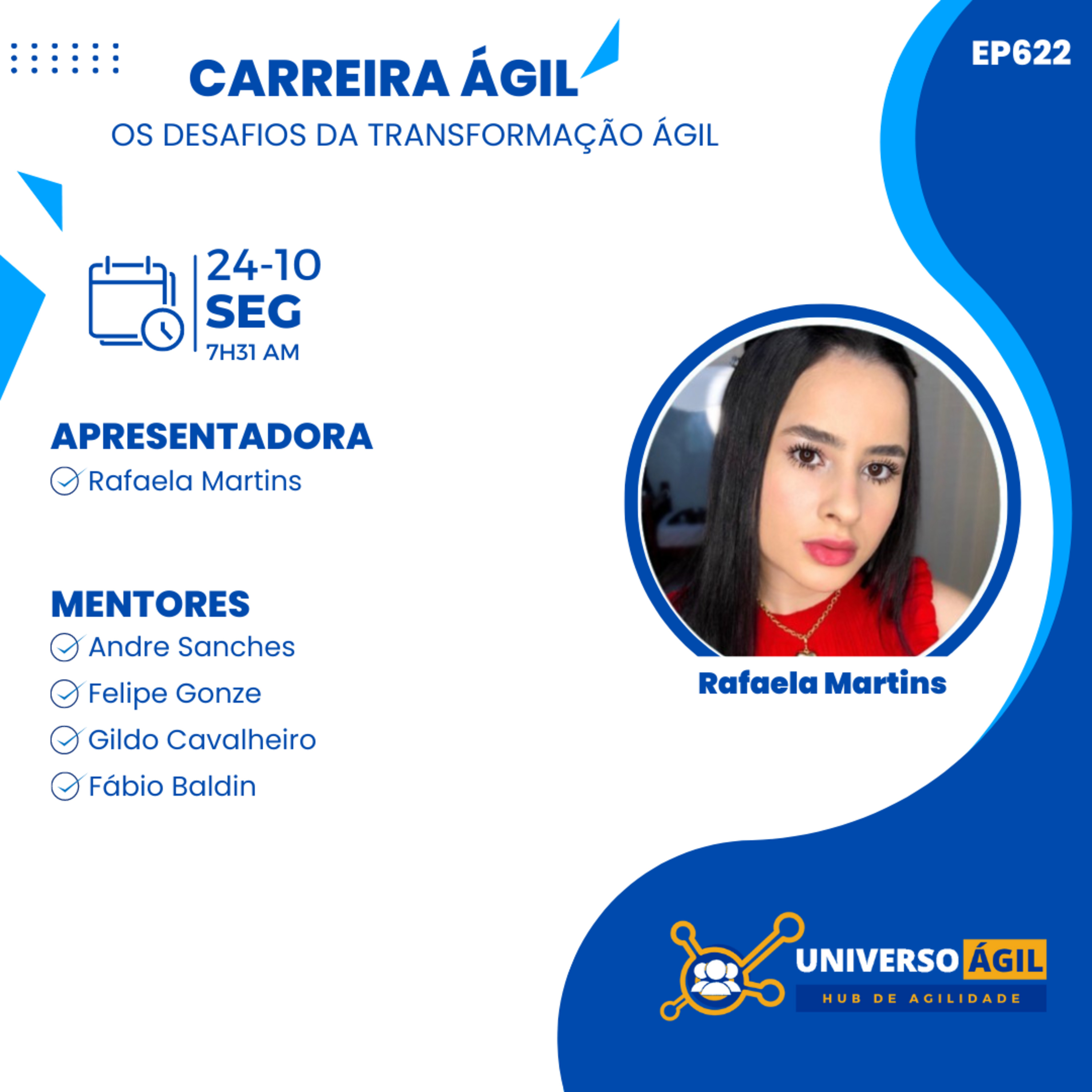 O quadro #CarreiraÁgil desta segunda-feira 24.10 7h31 (horário Brasília) do programa #JornadaAgil731 traz a apresentadora Rafaela Martins @oi.rafaelamartins e as pessoas moderadoras/curadoras, Andre Sanches @andrersanches, Felipe Gonze @felipegonze, Gildo Cavalheiro @gildo.cavalheiro, Fabio Baldin @fabiobaldin e você para debater os desafios da transformação ágil