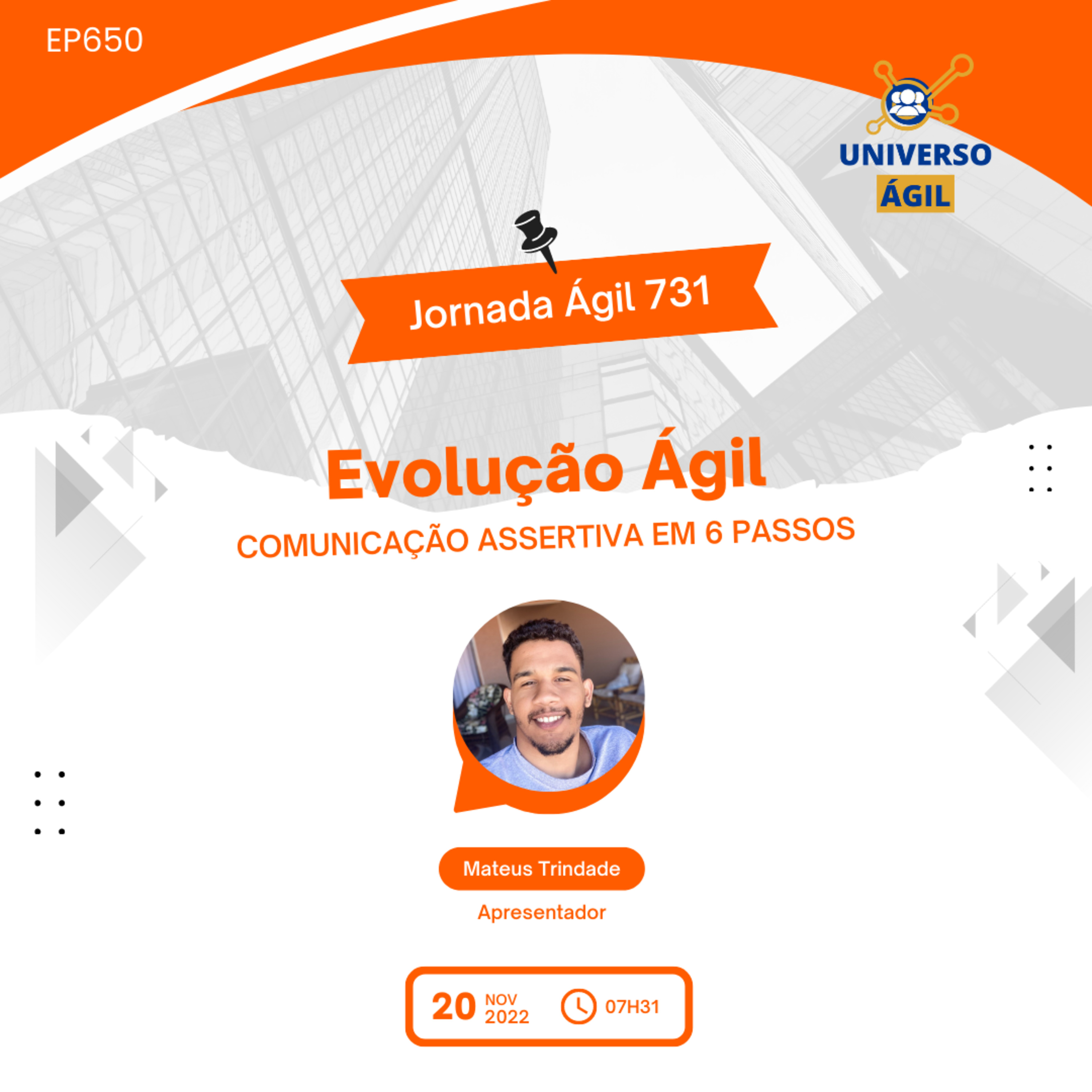 O quadro #EvolucaoAgil neste domingo 20.11 7h31 (horário Brasília) do programa #JornadaAgil731 traz o apresentador Mateus Trindade @trindadevoador e as pessoas curadoras e moderadoras Leopoldo Guzmán @leopoldoguzmanoficial ,Andre Sanches @andrersanche, Cíntia França @cintiasanches.ibcs e você para um painel/debate sobre Comunicação Assertiva em 6 passos, Potencializando oportunidades com RAPPORT