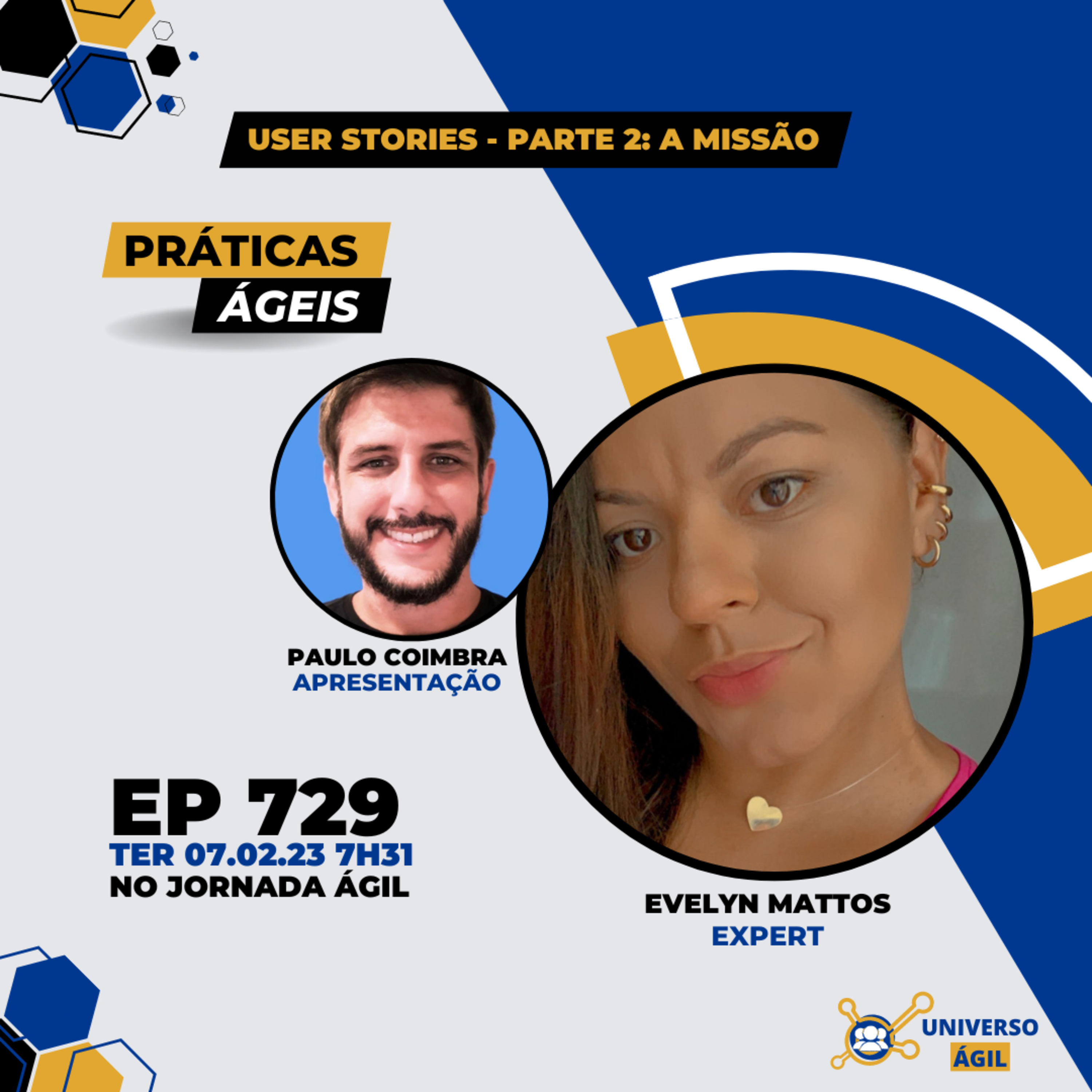 O quadro #PraticasAgeis desta terça-feira 07.02 7h31 (horário Brasília) no programa #JornadaAgil731 traz como apresentação Paulo Coimbra @paulohcapobianco , a pessoa expert Evelyn Mattos @evelynmattoss e o seleto grupo de pessoas moderadoras/curadoras Vanessa Blas @_bla_com_apesquisadora , Guilherme Santos @g .santosagile, Sarah Branco @sarah .m.branco e você para debater User Stories, Atendendo a pedidos, vamos falar mais de User Stories. Agora com convidados. Um papo sobre usuários, time e como podemos unir tudo isso através de uma abordagem aberta. Vem junto contar sua história no JA731!