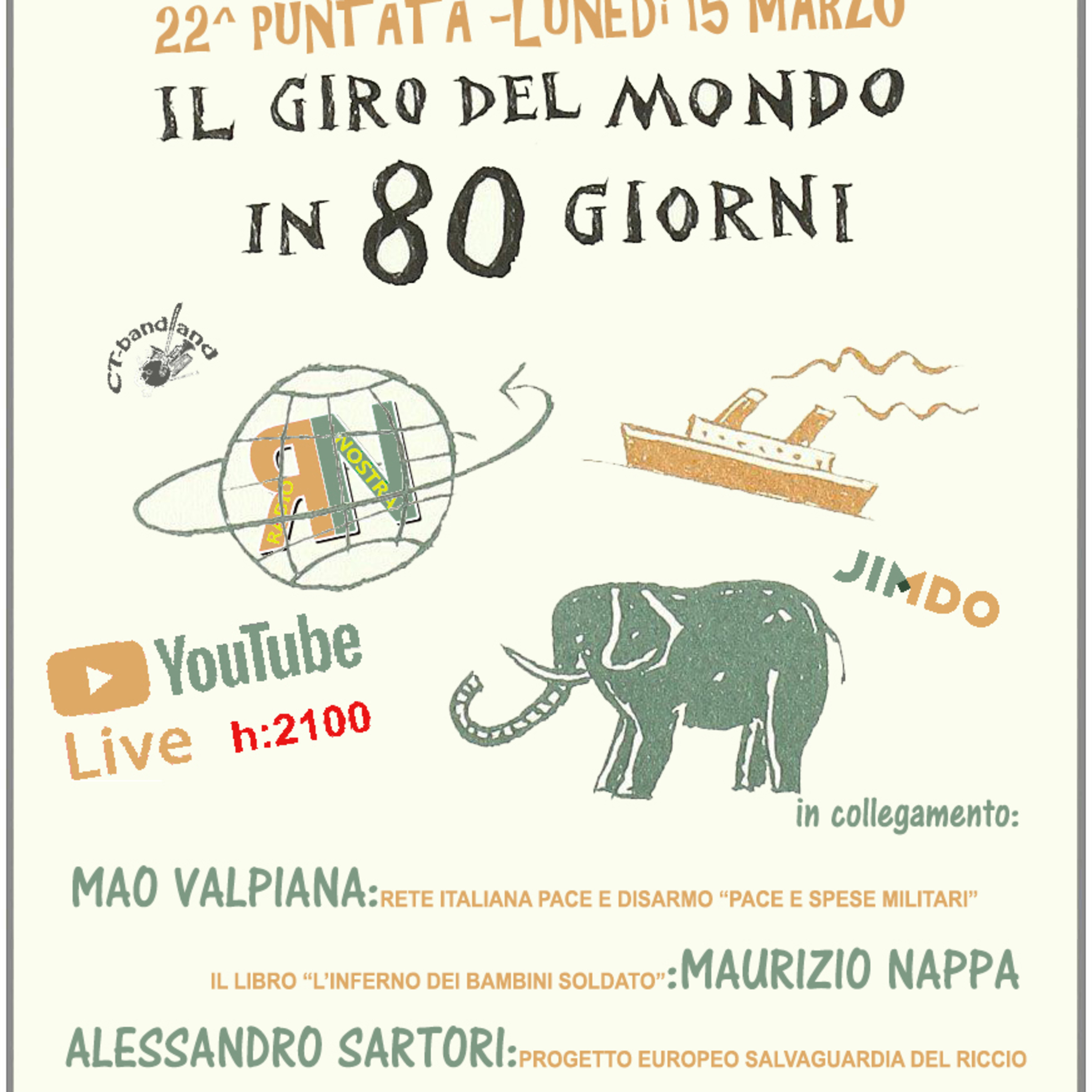 Gli ospiti di questa puntata MAO VALPIANA da Verona: RETE ITALIANA PACE E DISARMO “PACE E SPESE MILITARI” - MAURIZIO NAPPA da Zurigo: IL LIBRO “L’INFERNO DEI BAMBINI SOLDATO” - ALESSANDRO SARTORI da Venezia: PROGETTO EUROPEO SALVAGUARDIA DEL RICCIO -GIANENRICO "KIKKI" BALLARIN da Lio Piccolo: LA RICETTA DEL NOTTURNO - conducono da casa: GIANLUIGI - RICCARDO - ROSSELLA e commentano gli anni delle musicassette.