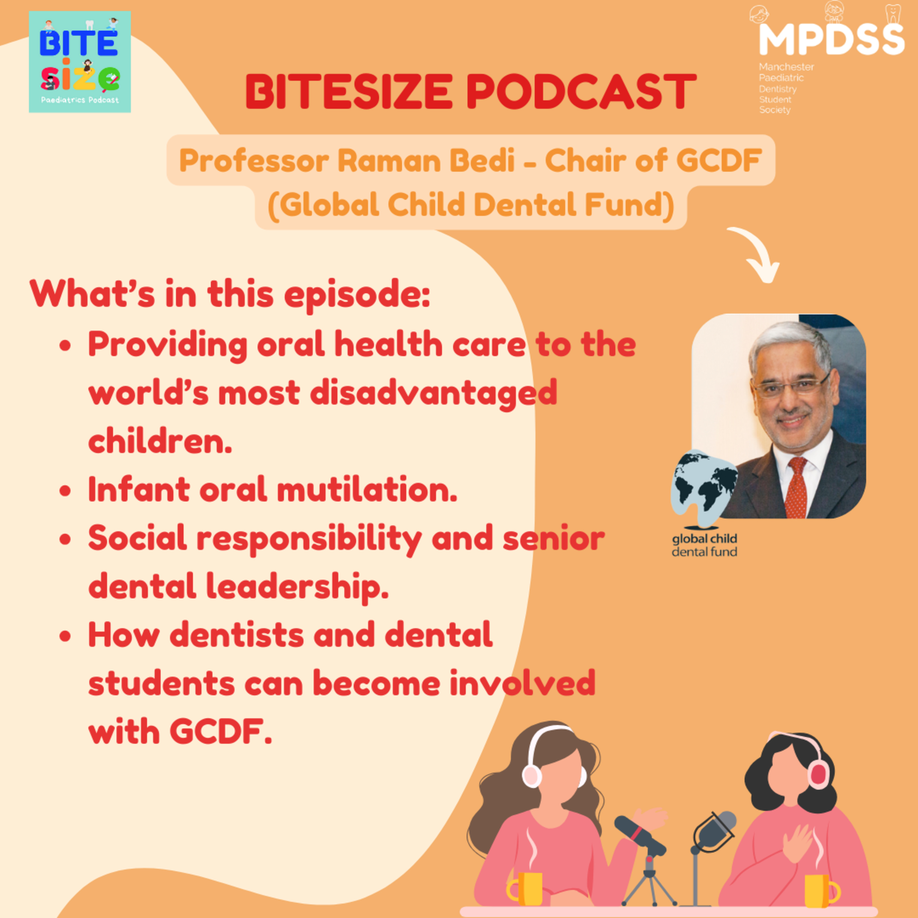 Welcome to the second episode of season 4. This episode was recorded back in 2023 with our co-hosts Sophia (BDS 2) and Chloe (BDS 3). In this episode, we are very fortunate to be hearing from Professor Raman Bedi, the chairman of the Global Child Dental Fund (GCDF). Professor Bedi details the incredible work of the charity in delivering projects across the globe, providing direct oral health care and education, building dental leadership and raising social responsibility.