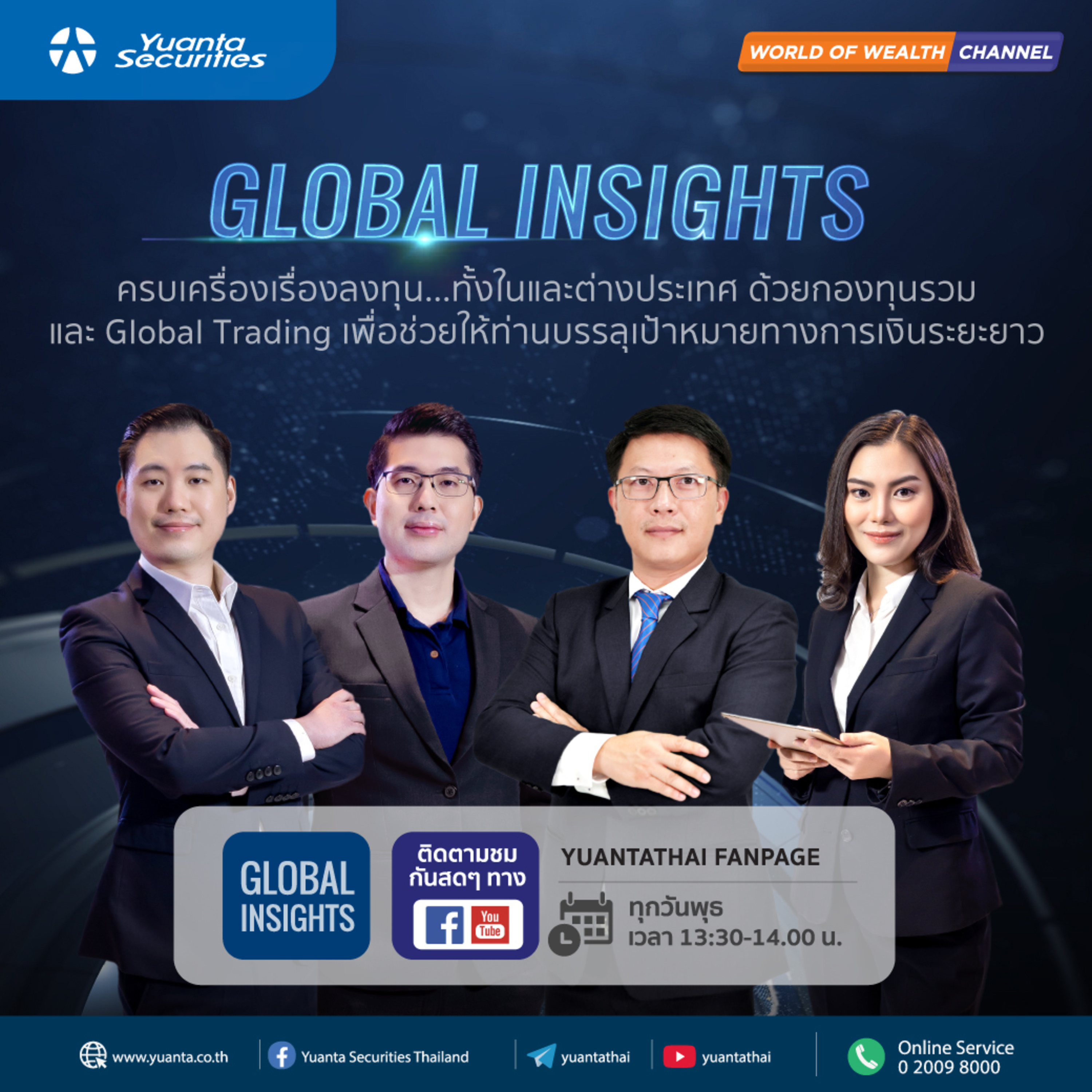 ทุกวันพุธ เวลา 13:30 น. ครบเครื่องเรื่องลงทุน ด้วยผลิตภัณฑ์ทางการลงทุนที่หลากหลายทั้งกองทุนรวม (Mutual Funds) และการลงทุนตรงในต่างประเทศ (Global Trading) ในหุ้นและ ETF เพื่อช่วยท่านวางแผนการลงทุนในการบรรลุเป้าหมายทางการเงินระยะยาว