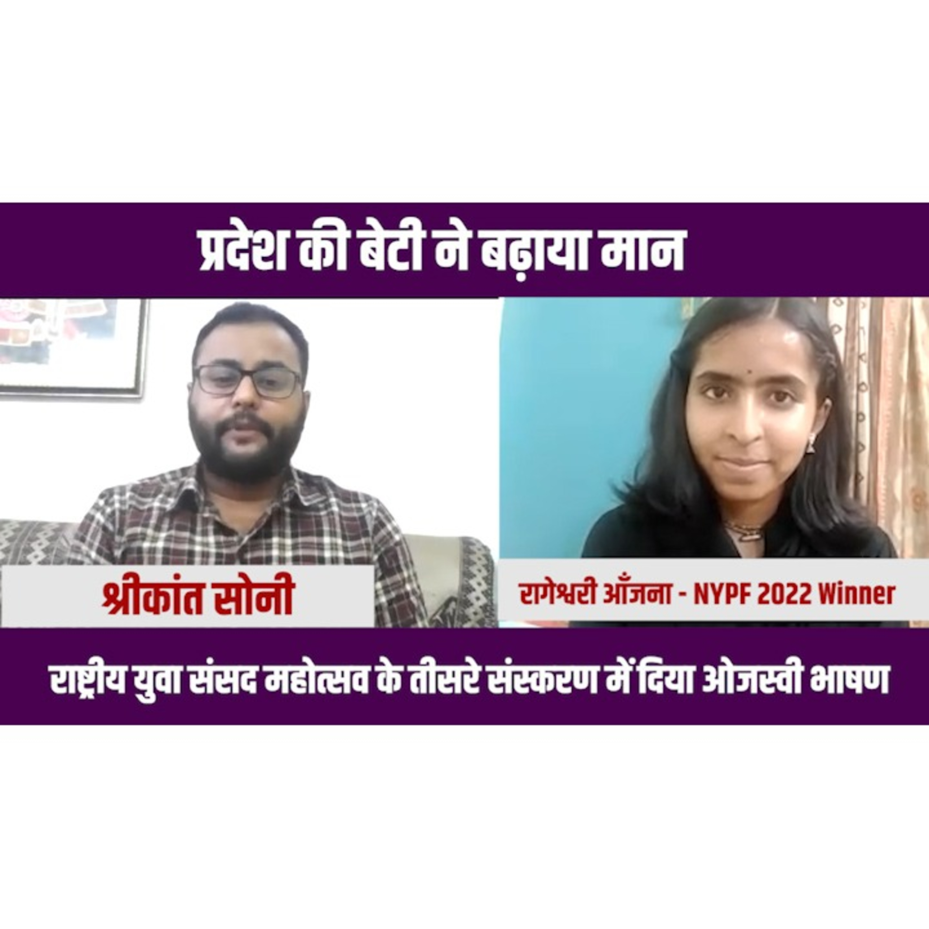 #NYPF2022 में देश में पहला स्थान प्राप्त करने वालीं भोपाल की सुश्री रागेश्वरी आँजना ने 2 लाख से ज्यादा प्रतिभागियों को पीछे छोड़ अपने ओजस्वी भाषण से देश में मध्यप्रदेश को किया गौरवान्वित।