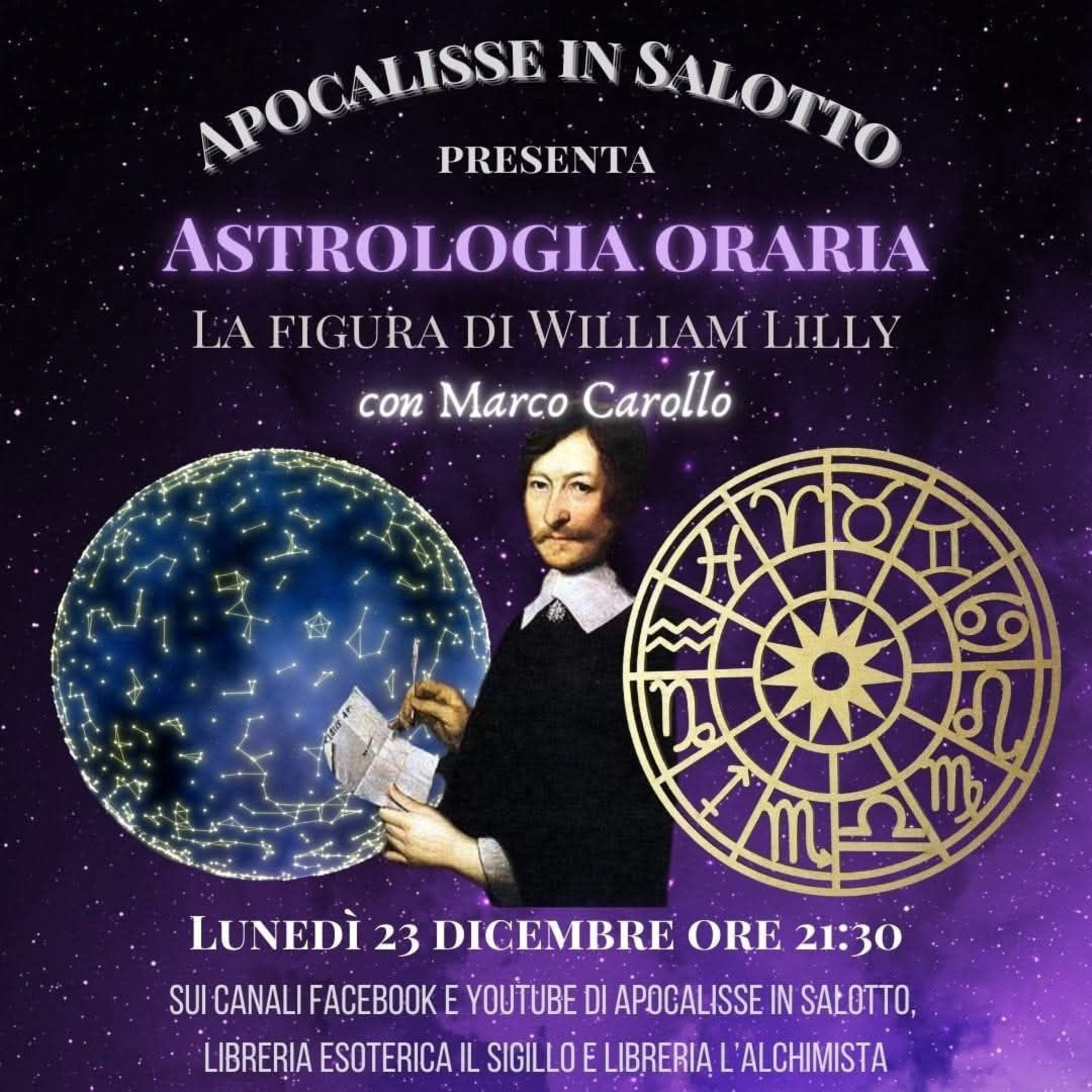 Astrologia oraria - con Marco CarolloL’Astrologia Oraria, o Astrologia delle Interrogazioni, fa parte del corpus dottrinario della tradizione astrologica e trova il suo fondamento nell'assunto della sincronicità tra il microcosmo della carta Oraria ed il macrocosmo tolemaico, ossia l’Universo.Derivata dall'astrologia araba – dove è di più frequente utilizzo – l'Astrologia oraria ha raggiunto l’apice in Occidente grazie a William Lilly, astrologo e scrittore inglese del XVII secolo e autore, fra gli altri, di “Christian Astrology”.