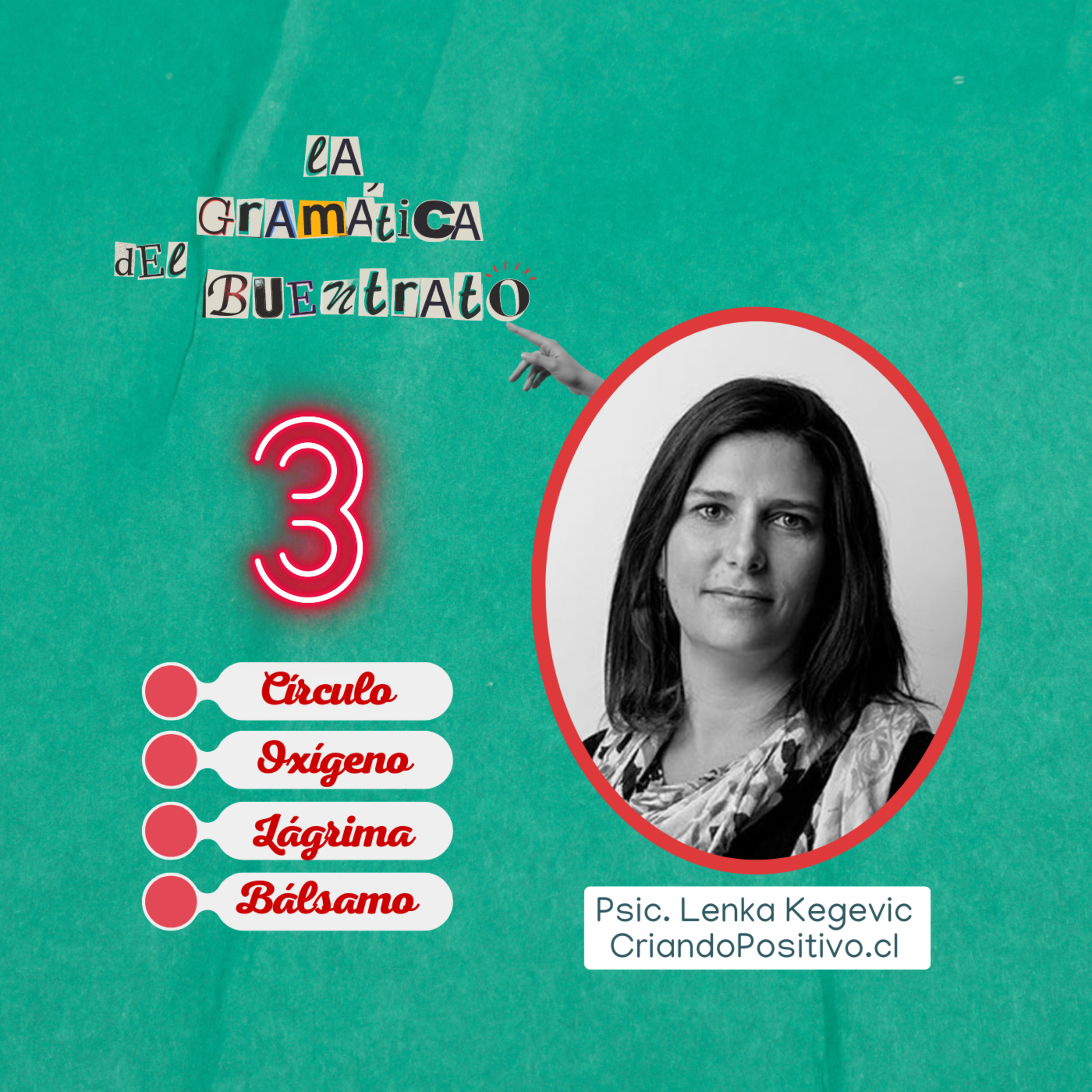 En este TERCER episodio tuve el honor y placer de tener como invitada a una mujer generosa y profesional excepcional, la Psic. Lenka Kegevic, psicóloga chilena, creadora de 'Criando Positivo' con quien entretejimos las PALABRAS 🔵#Círculo ; 🌬#Oxígeno ; 🥲#Lágrima y 🧴#Bálsamo . 👥 Acompáñanos a co-construir la #gramática 📚de una #NuevaLengua: la lengua de los buenos tratos.