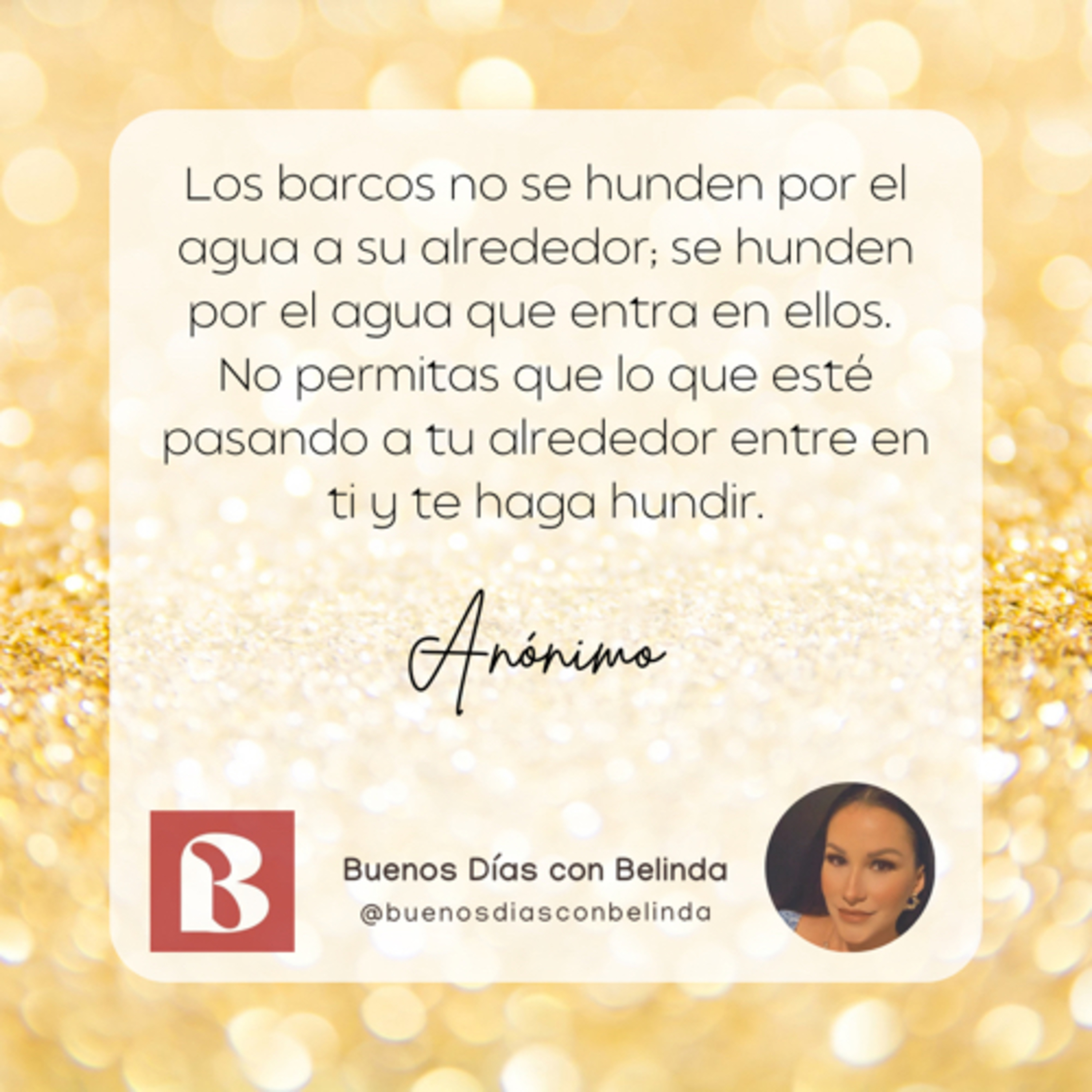 Los barcos no se hunden por el agua a su alrededor; se hunden por el agua que entra en ellos. No permitas que lo que esté pasando a tu alrededor entre en ti y te haga hundir.
