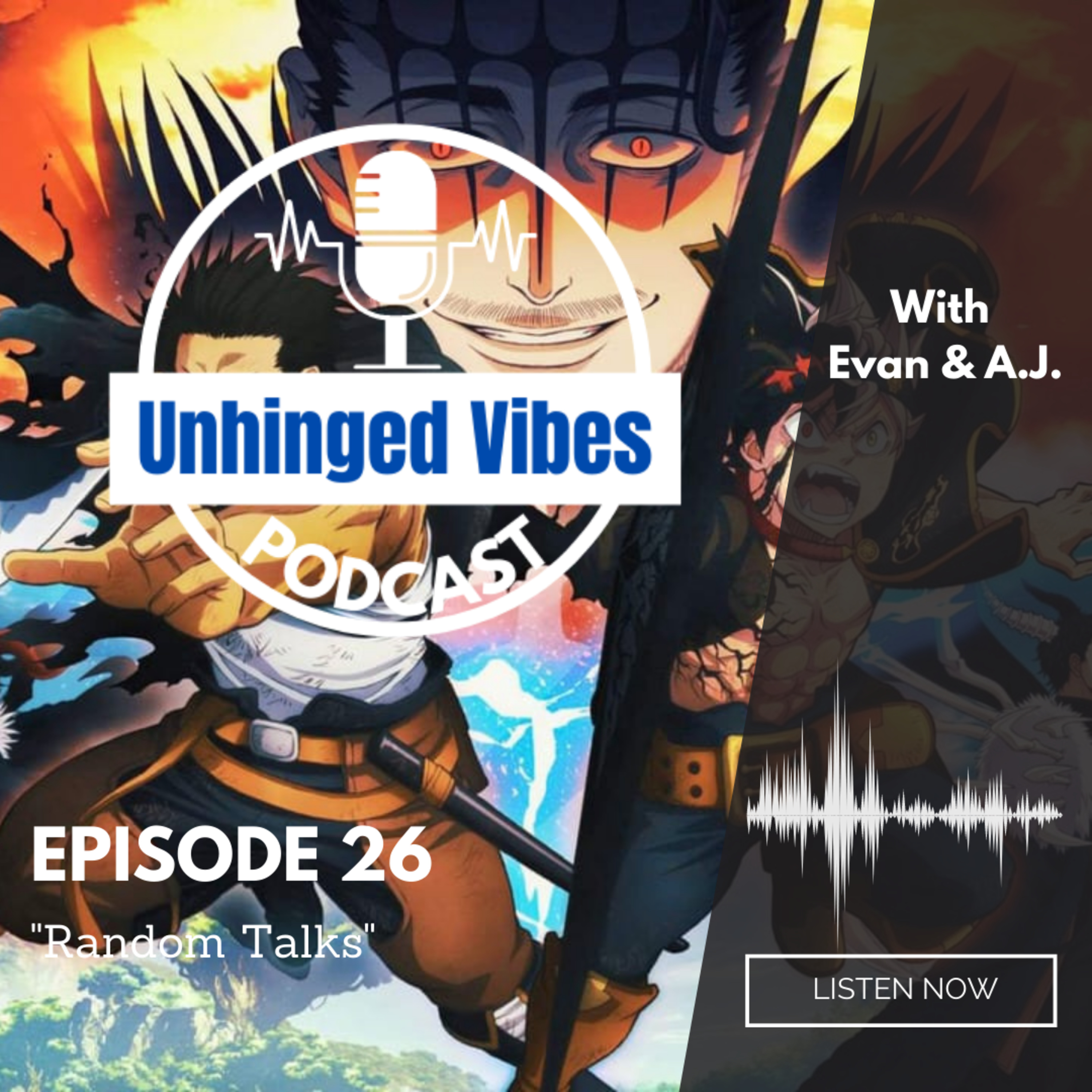Welcome to the Unhinged Vibes Podcast with A.J. and Evan. In this episode, We talk about some anime! Mostly in the realm of Black Clover, we talk about the likable characters, the cool abilities, and what we would want to do if we were put in their shoes! If enjoyed the episode drop a share with a friend or family member and remember to stay tuned for more!