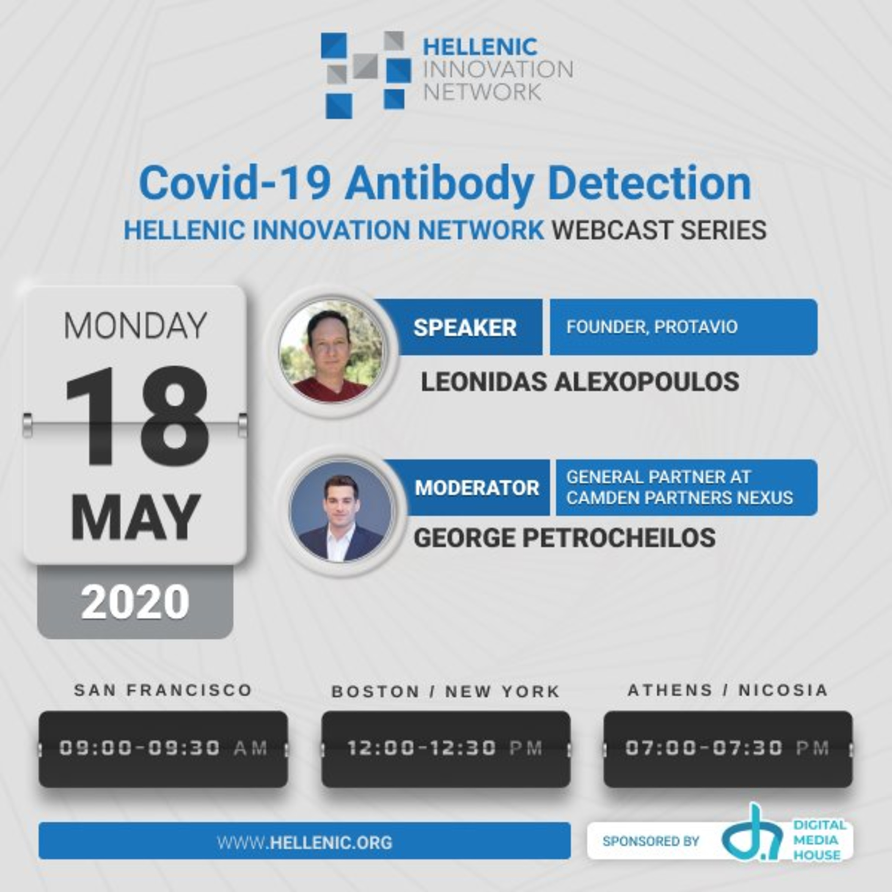 Hellenic Innovation Network, with the support of the Greek Consulate of Boston and MIT Enterprise Forum Greece, hosts events to educate those in the US about technology innovation and entrepreneurship in Greece, and offer Greek entrepreneurs an opportunity to pitch and network in the US. While our events are typically held in Boston, due to the Covid-19 situation we are hosting a series of 30-minute webcasts, in order to keep our community connected until our next in-person event in the Fall.