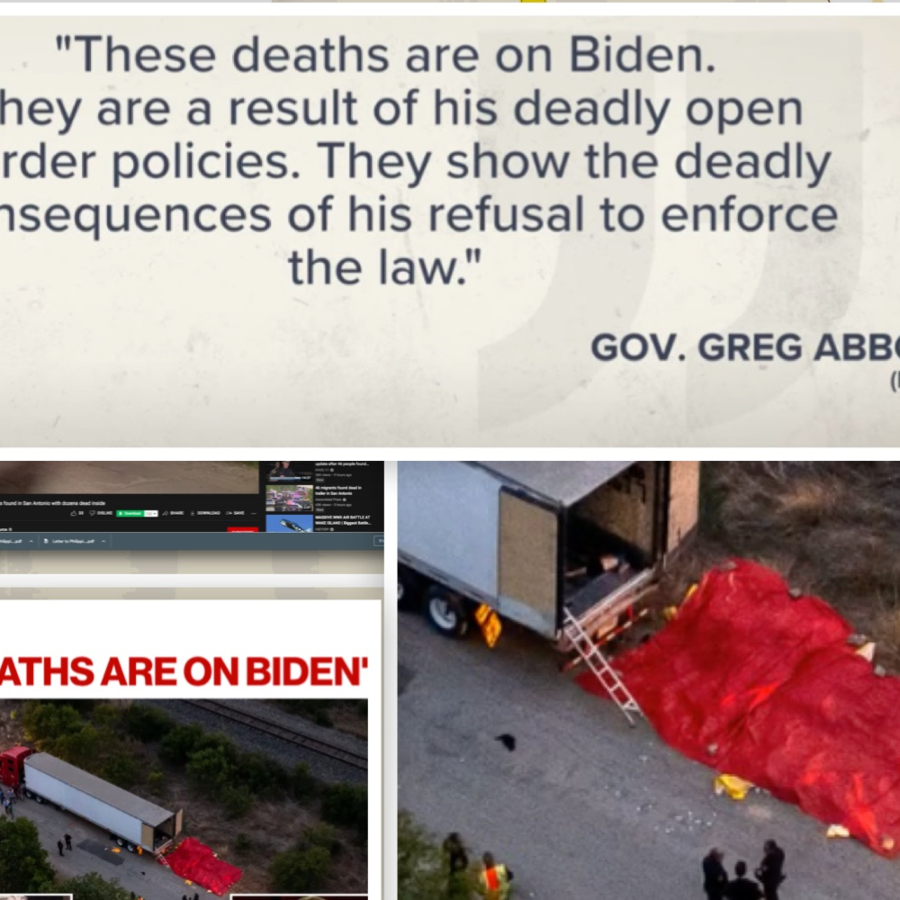 Hours after the bodies were discovered in the back of an 18-wheeler in San Antonio Monday evening, the Republican governor fired off a tweet saying, “These deaths are on Biden.”