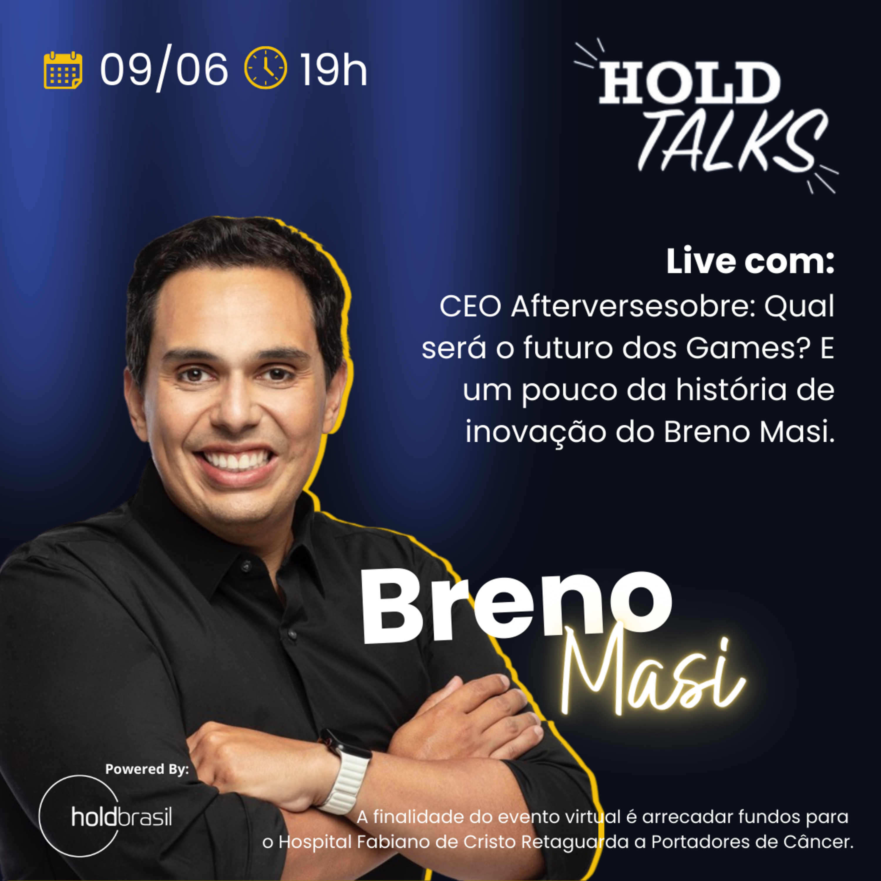 Marcos Chaves , Head Corporate Sales of HoldBrasil, baterá um super papo com Breno Masi CEO and Founder na Afterverse com mais de 50 milhões de usuários mensais com o jogo PK XD e Crafty Lands, sobre: Qual será o futuro dos video-games? e também contaremos um pouco mais da história do Breno e sua trajetória no mundo dos Games. Nosso HoldTalks tem também a finalidade de arrecadar fundos que serão revertidos para o Hospital Fabiano de Cristo - Retaguarda a Portadores de Câncer. Ajude esta causa!