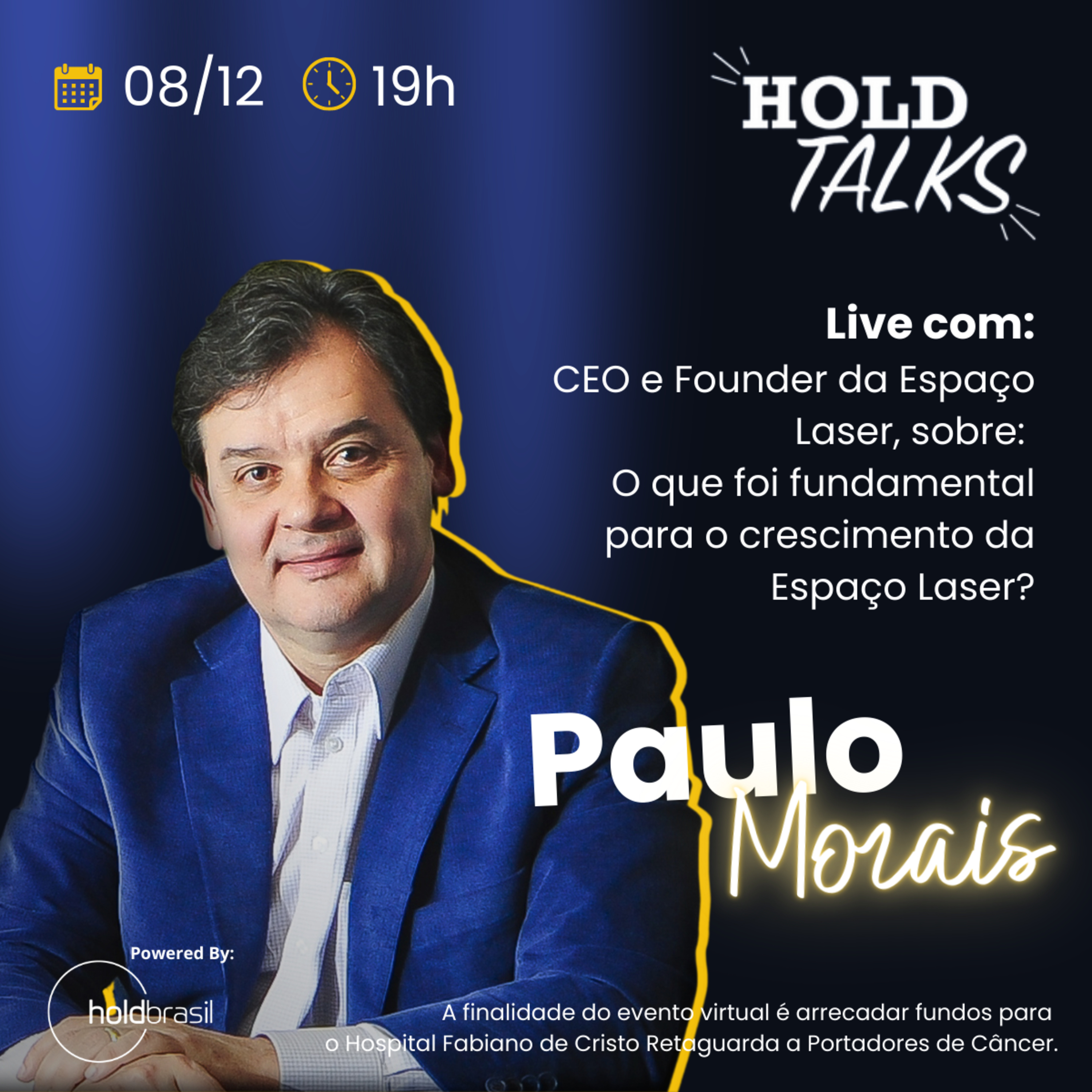 Marcia Exposito, Head Legal Tech of HoldBrasil, baterá um super papo com Paulo Morais, CEO e Founder da Espaço Laser, sobre: O que foi fundamental para o crescimento da Espaço Laser e também contaremos um pouco mais da história do Paulo e sua trajetória no mundo corporativo. Nosso HoldTalks tem também a finalidade de arrecadar fundos que serão revertidos para o Hospital Fabiano de Cristo - Retaguarda a Portadores de Câncer. Ajude esta causa !