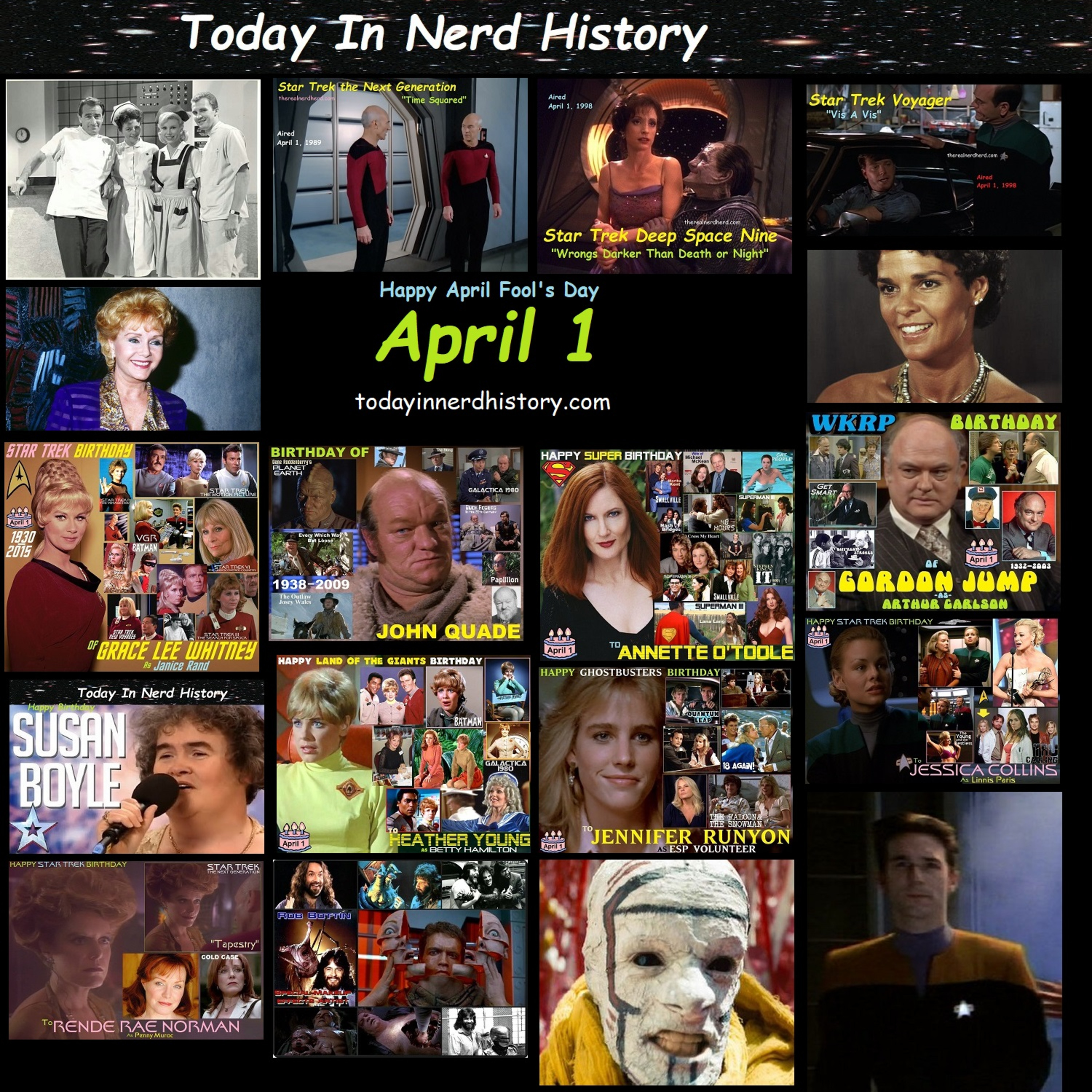 . #TodayInNerdHistory #April1 #GeneralHospital #StarTrek #StarTrekTheNextGeneration #TimeSquared #StarTrekDeepSpaceNine #WrongsDarkerThanDeathOrNight #StarTrekVoyager #VisAVis #LonChaney #DebbieReynolds #AliMacGraw #GraceLeeWhitney #JohnQuade #AnnetteOToole #GordonJump #SusanBoyle #HeatherYoung #JenniferRunyon #JessicaCollins #RendeRaeNorman #EllenHollman #RobBottin #JeffWitzke #TonyGuma #Birthday #TheRealNerdHerd #TheNerdHerd #NerdHerd #Nerd