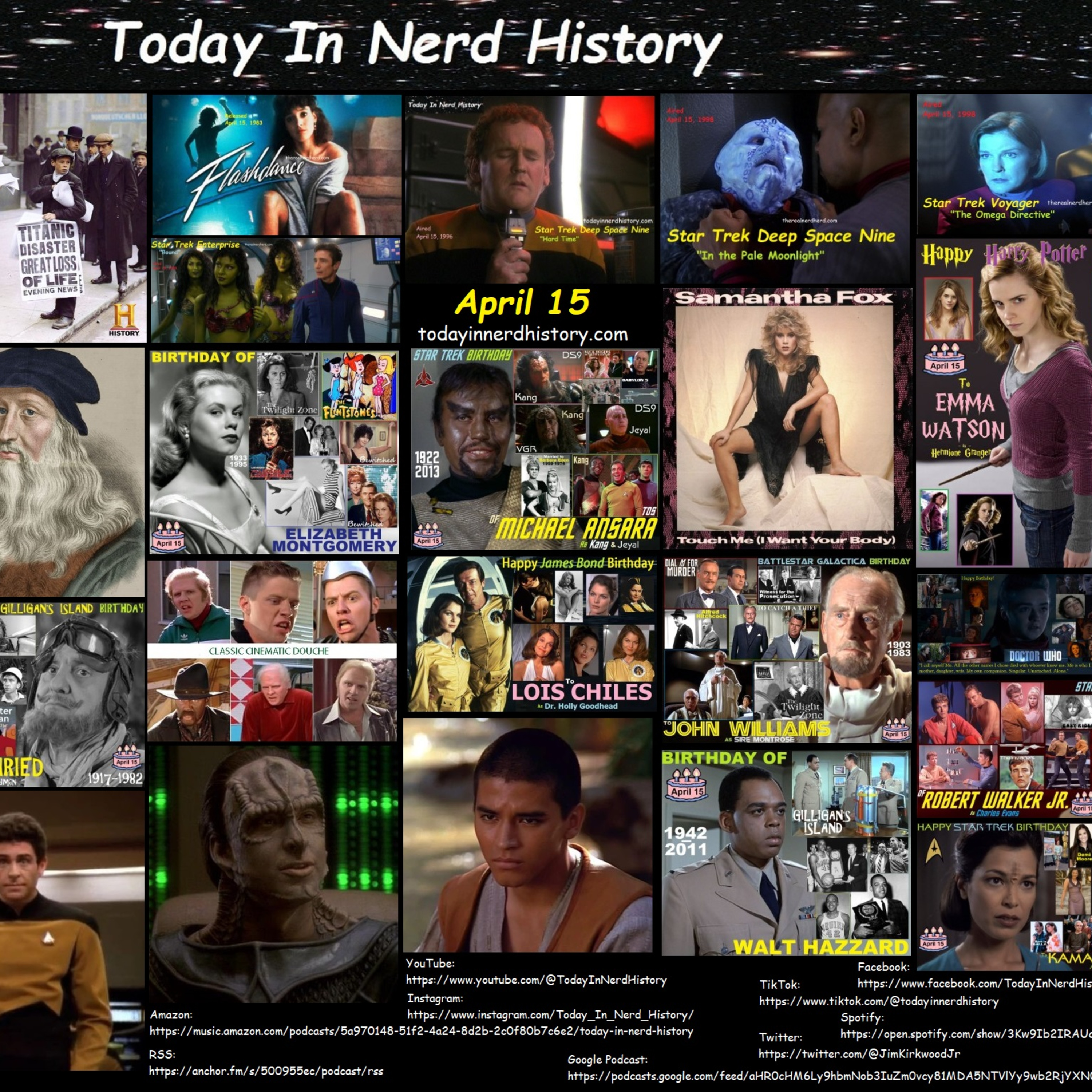 . #TodayInNerdHistory #April15 #Titanic #Flashdance #StarTrek #StarTrekDeepSpaceNine #HardTime #InThePaleMoonlight #StarTrekVoyager #TheOmegaDirective #StarTrekEnterprise #Bound #LeonardoDaVinci #ElizabethMontgomery #SamanthaFox #MichaelAnsara #EmmaWatson #HansConried #TomWilson #LoisChiles #JohnWilliams #MaisieWilliams #RobertWalkerJr #WaltHazzard #DarinCooper #DouglasSpain #KennethMeseroll #Birthday #TheRealNerdHerd #TheNerdHerd #Nerdherd #Nerd