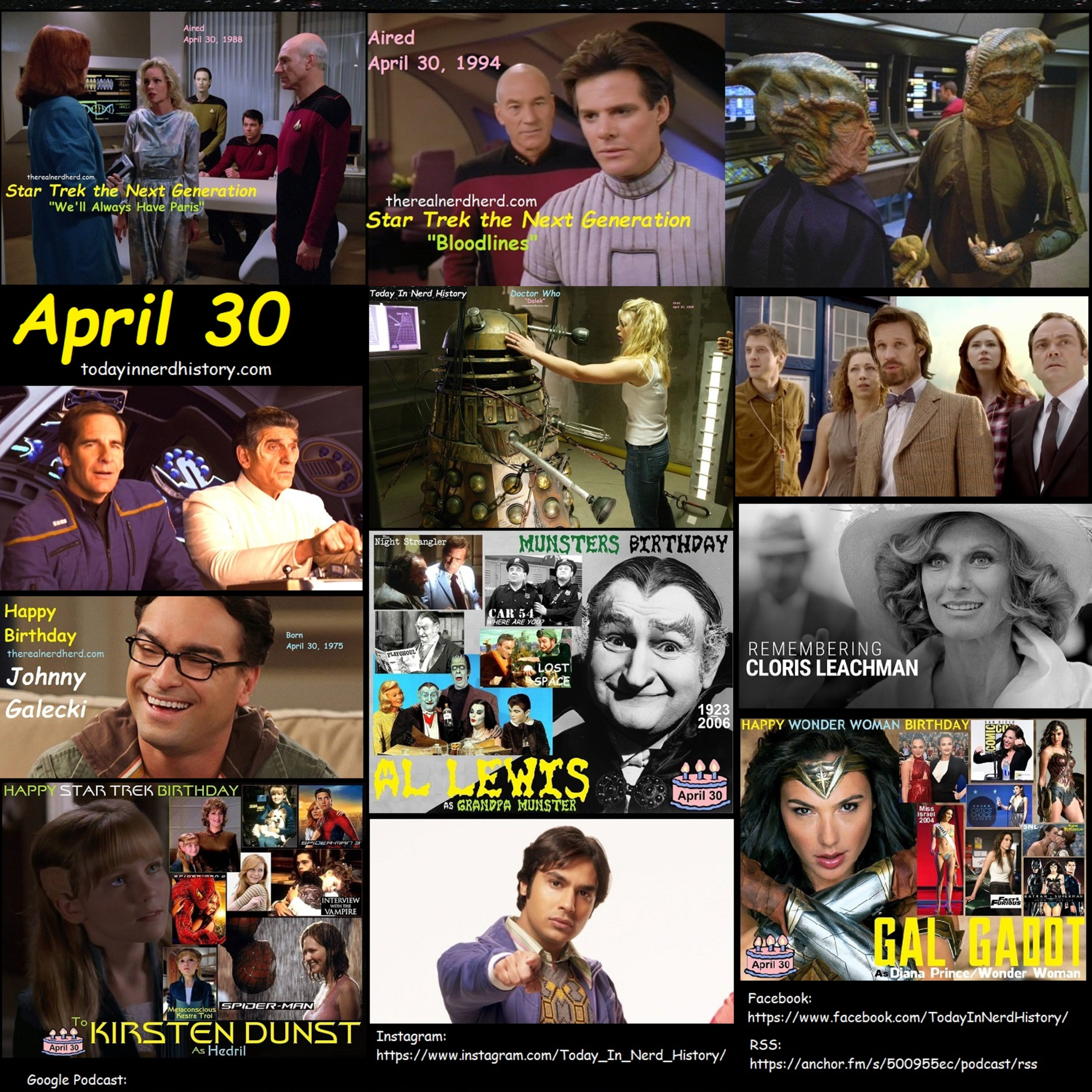 . #TodayInNerdHistory #April30 #StarTrek #StarTrekTheNextGeneration #WellAlwaysHaveParis #Bloodlines #StarTrekVoyager #DistantOrigin #StarTrekEnterprise #Cogenitor #DoctorWho #Dalek #DayOfTheMoon #AlLewis #JohnnyGalecki #ClorisLeachman #KunalNayyar #KirstenDunst #GalGadot #Birthday #Podcast #video #fyp #TheRealNerdHerd #TheNerdHerd #Nerdherd #Nerd