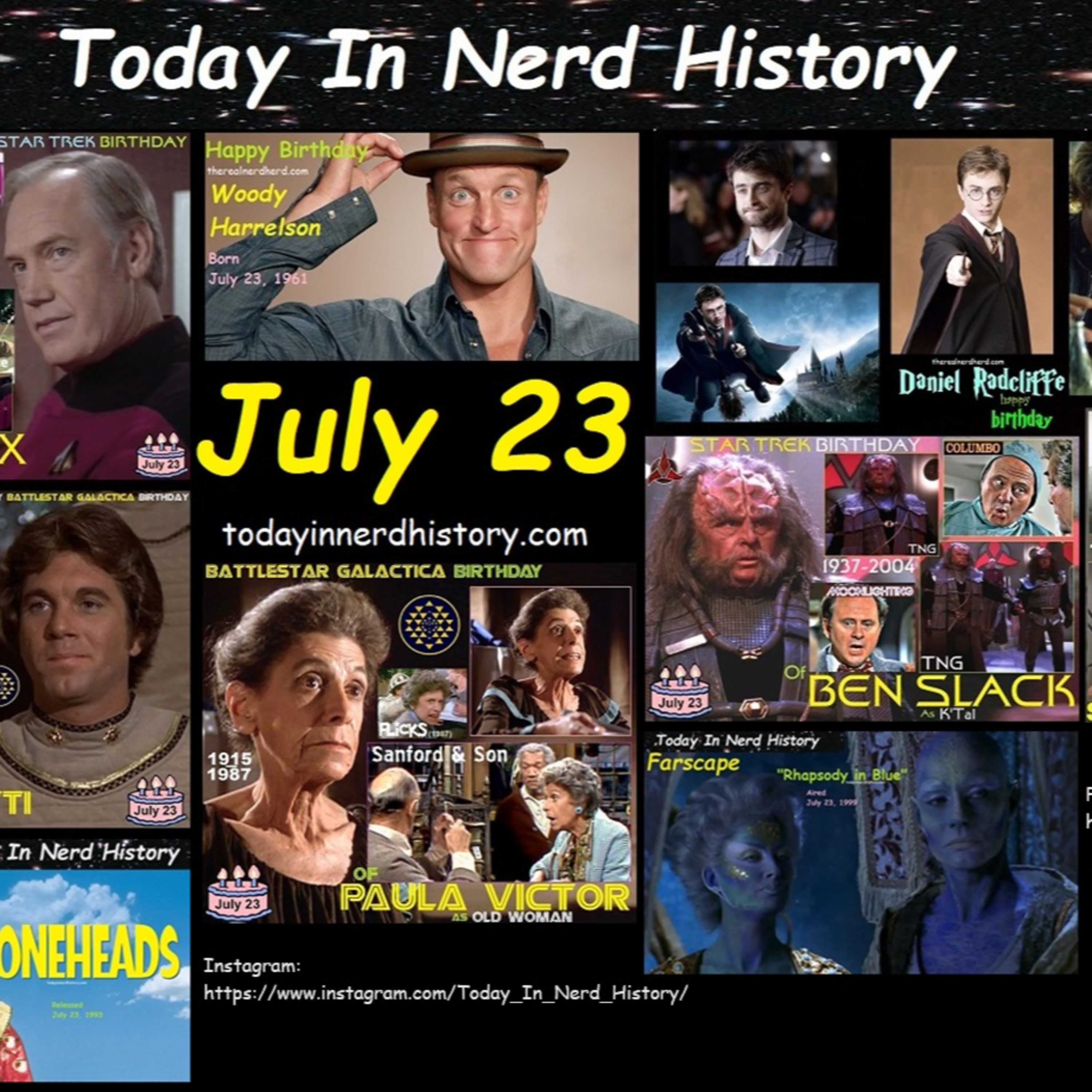 . #TodayInNerdHistory #July23 #Coneheads #Farscape #RhapsodyInBlue #RonnyCox #WoodyHarrelson #DanielRadcliffe #PhilipSeymourHoffman #LarryManetti #EdieMcClurg #BenSlack #SandraGould #JulietAnderson #PaulaVictor #Birthday #Video #History #Released #ReleaseDate #Aired #AirDate #News #OTD #FYP #Nerd .