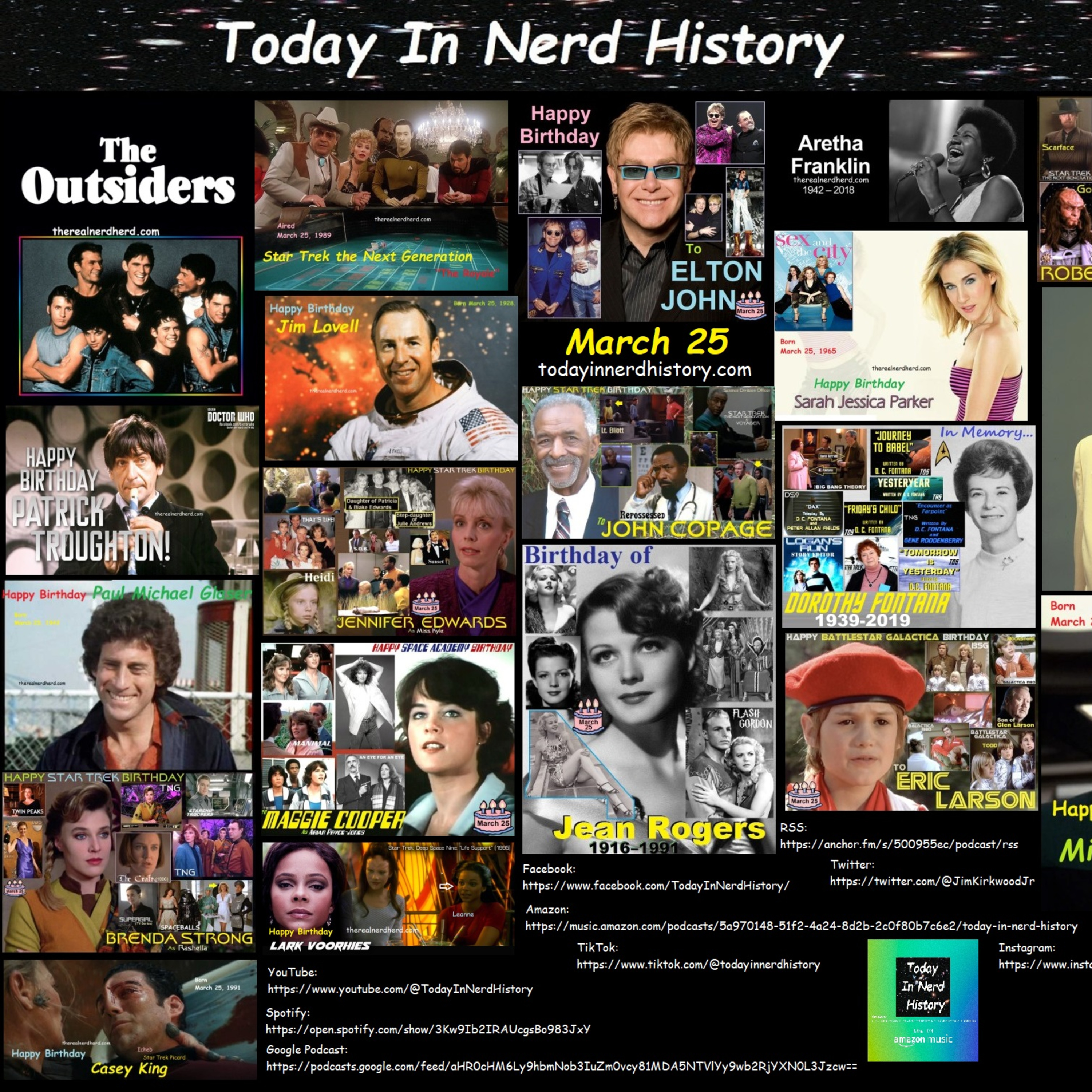 . #TheOutsiders #StarTrek #StarTrekTheNextGeneration #TheRoyale #EltonJohn #ArethaFranklin #RobertOReilly #PatrickTroughton #JimLovell #SarahJessicaParker #HowardCosell #PaulMichaelGlaser #JenniferEdwards #JohnCopage #DorothyFontana #BrendaStrong #MaggieCooper #JeanRogers #LarkVoorhies #MichaelReisz #EricLarson #CaseyKing #Birthday #March25 #TodayInNerdHistory #TheRealNerdHerd #TheNerdHerd #NerdHerd #Nerd
